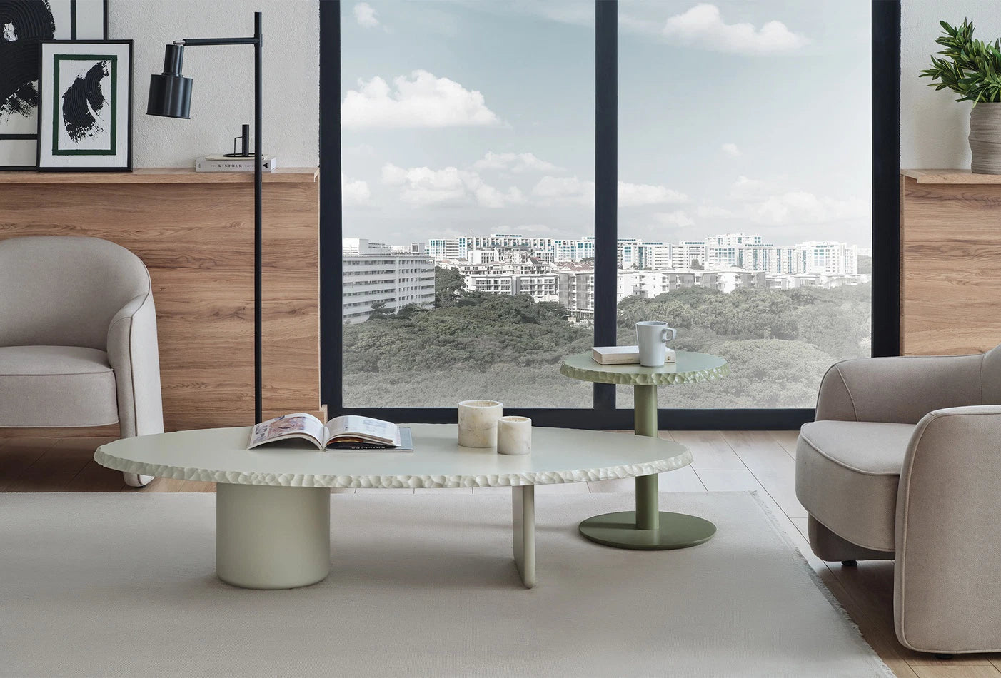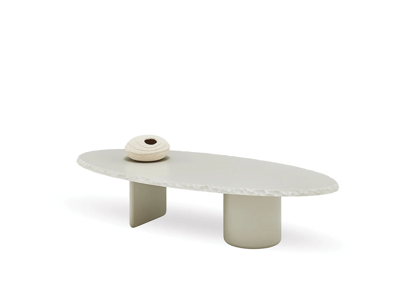 ALPHA SMOKING TABLE, which stands out with its modern design, combines the richness of the elliptical shape with light gray tones. With its contrasting leg design and CNC edge-cutting detail, it redefines elegance.