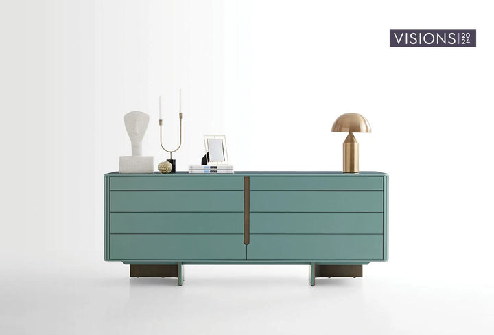 As part of the Visions 2024 series, the outstanding ATHENS CHEST OF DRAWERS draws attention with its modern style and timeless design, and complements the overall aesthetic of the series with its antique bronze legs.
