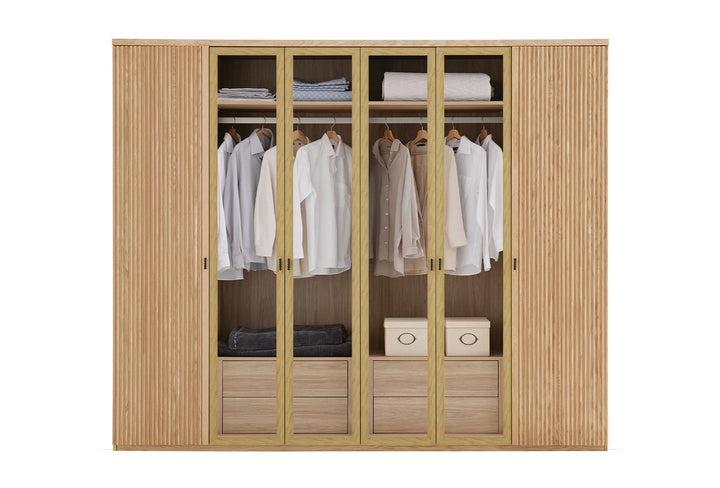With its MDF oak-covered surface and machining details that bring dynamism to the minimalist design line, the AUSTIN 6-DOOR WARDROBE presents a contemporary interpretation of aesthetics.