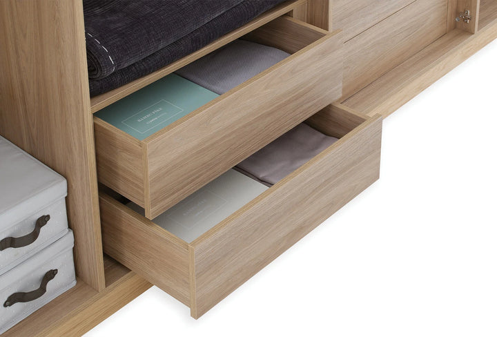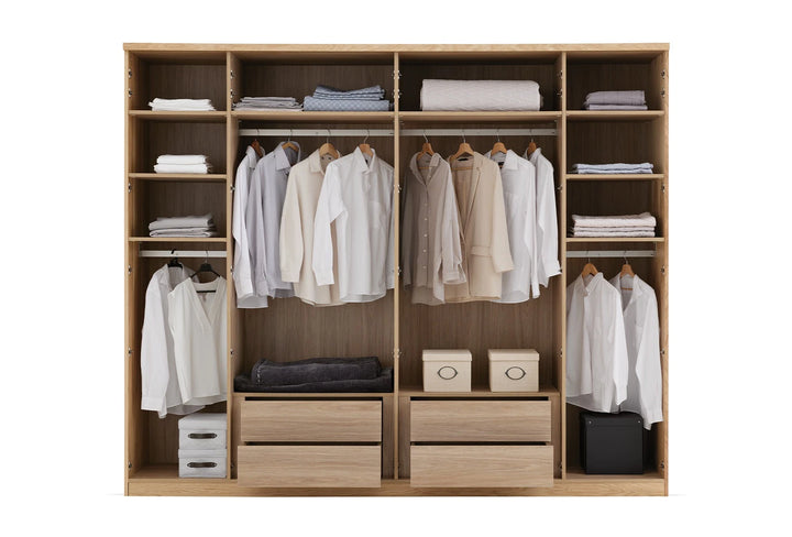 Combining the warmth of oak with elegant black metal handles, the AUSTIN 6-DOOR WARDROBE reflects the finest form of modern design.