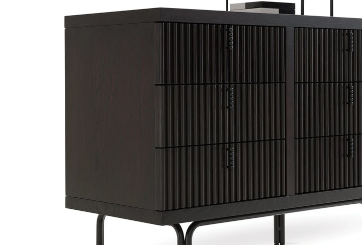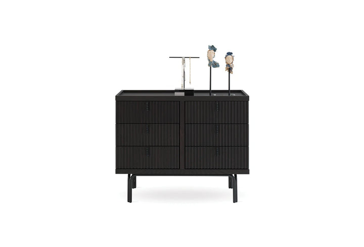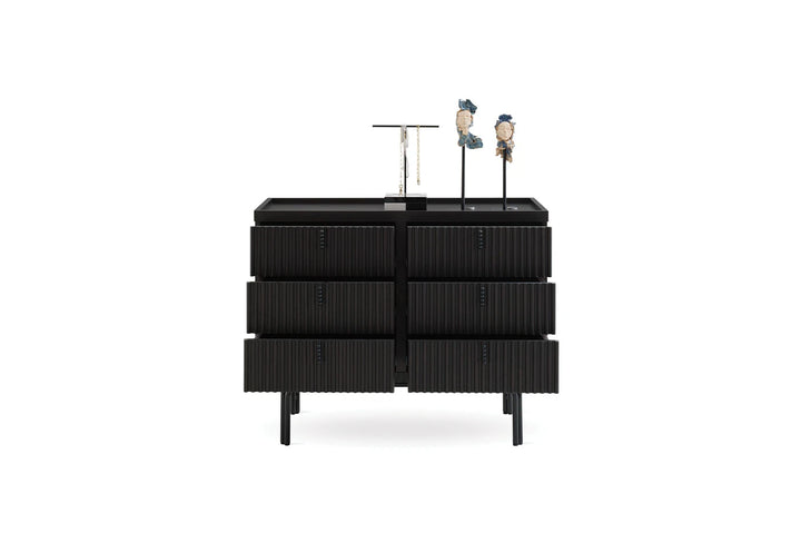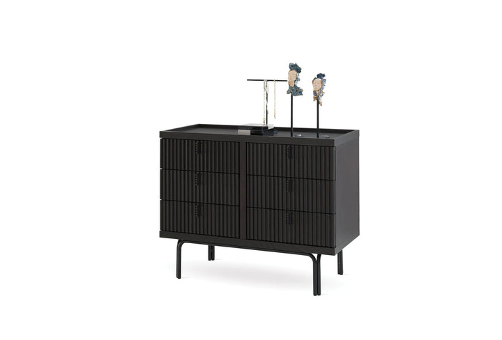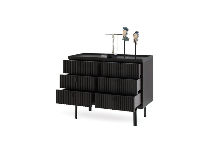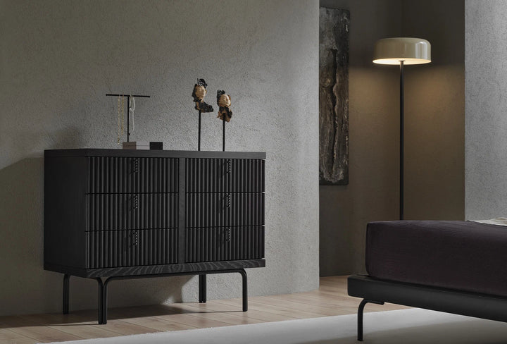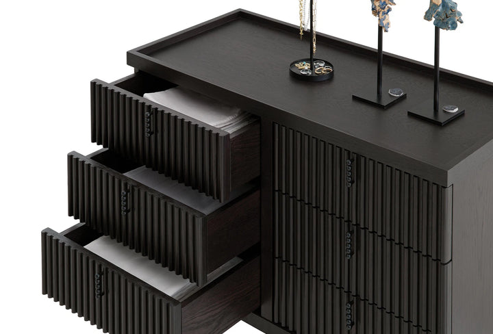 With its MDF oak-covered surface and machining details that bring dynamism to the minimalist design line, the AUSTIN TALL CHEST OF DRAWERS presents a contemporary interpretation of aesthetics.