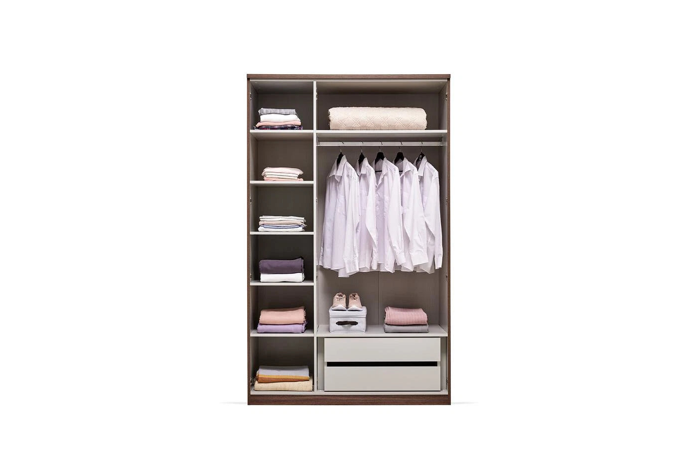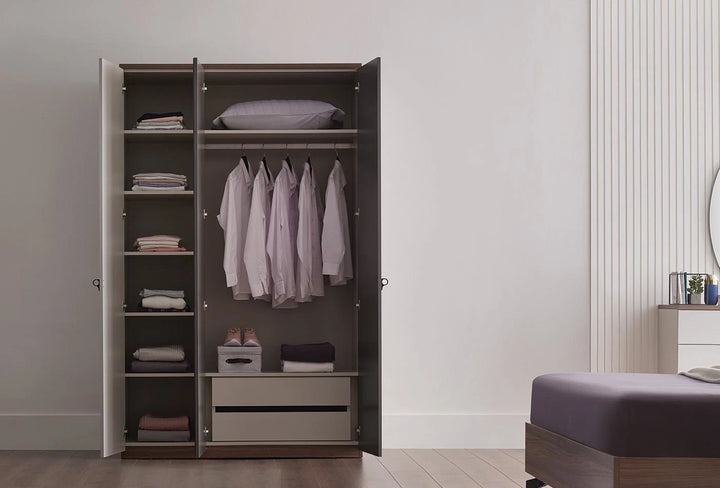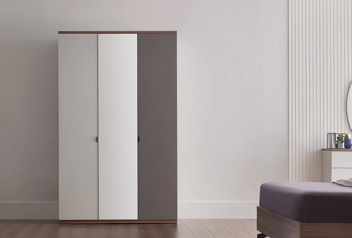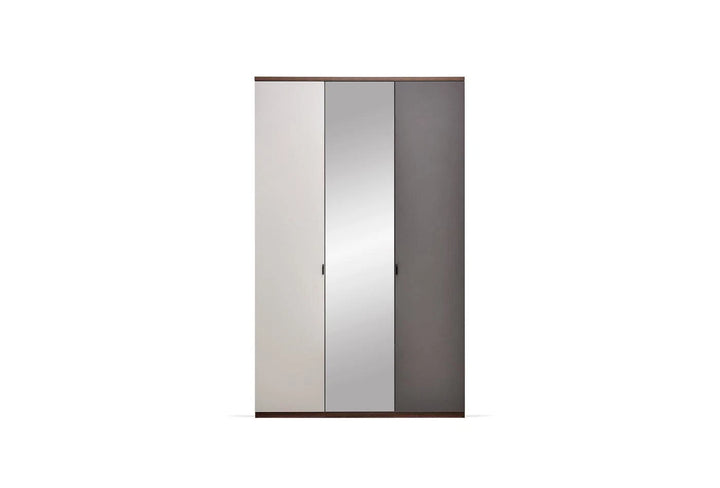 Reflecting the sophisticated elegance of walnut, gray and off-white surfaces, the CORDELL 3-DOOR WARDROBE, with matching matte black metal handles and a natural mirror, allows for the creation of spacious bedrooms.