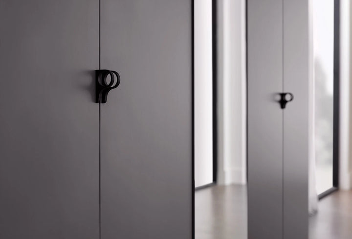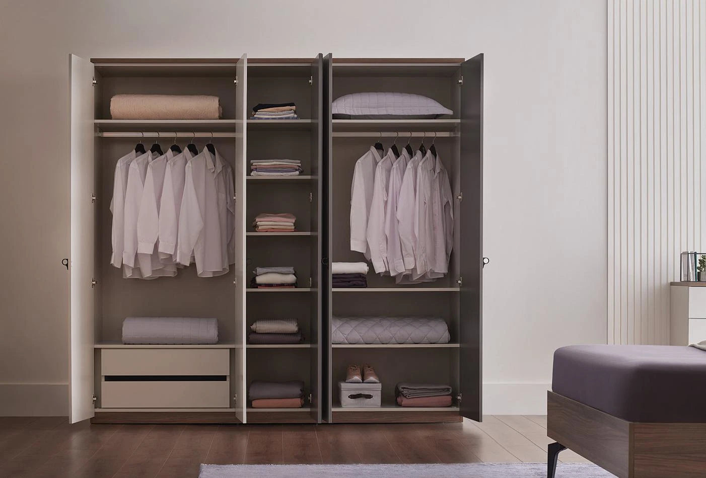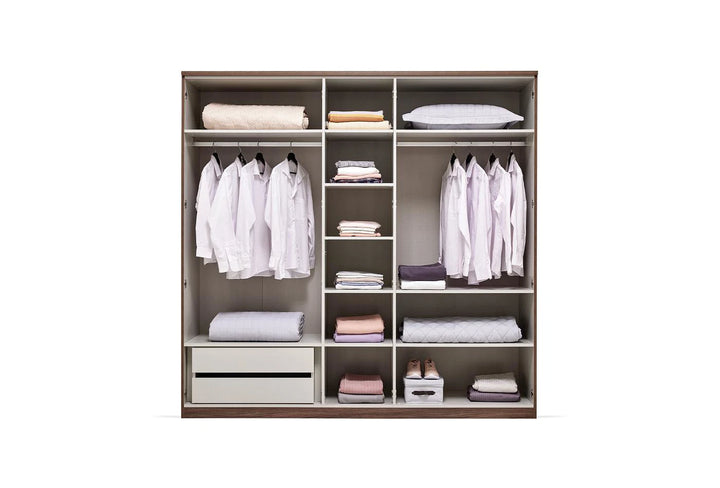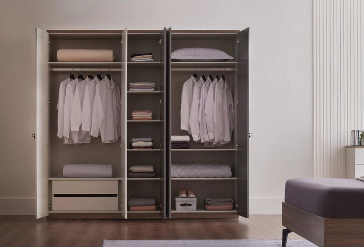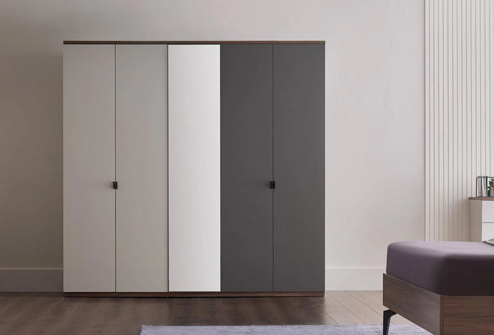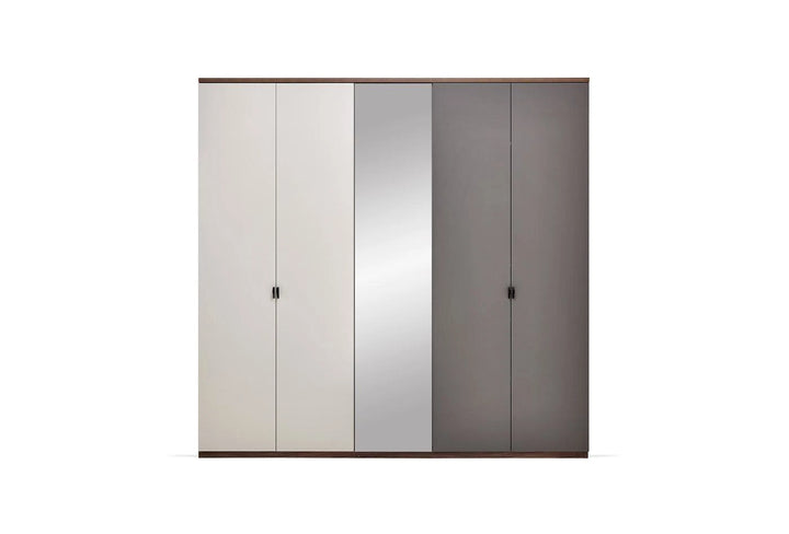 Reflecting the sophisticated elegance of walnut, gray and off-white surfaces, the CORDELL 5-DOOR WARDROBE, with matching matte black metal handles and a natural mirror, allows for the creation of spacious bedrooms.