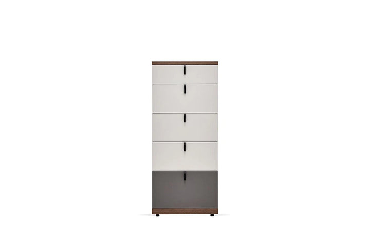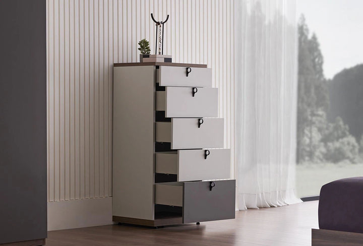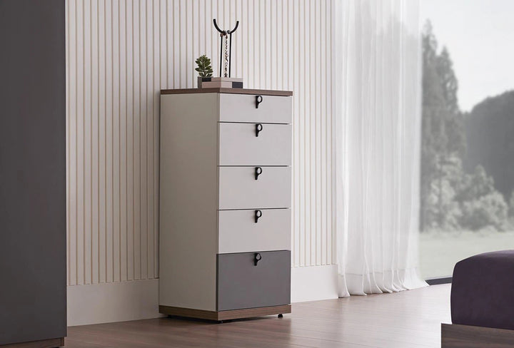 The CORDELL HIGH CHEST OF DRAWERS successfully presents an eye-catching appearance with its youthful and modern design lines. Designed with a walnut, gray and off-white color combination, the CORDELL HIGH CHEST OF DRAWERS creates an aesthetic appearance with its soft color transitions.