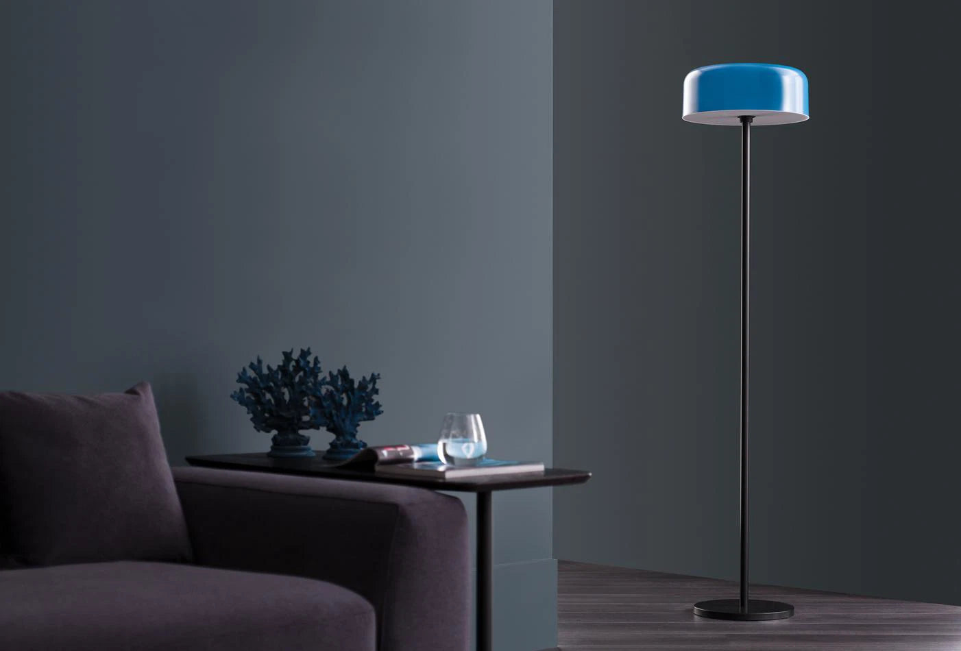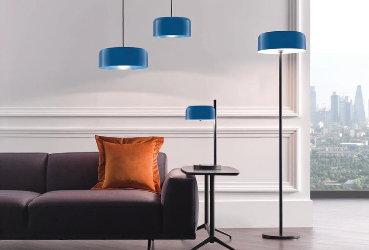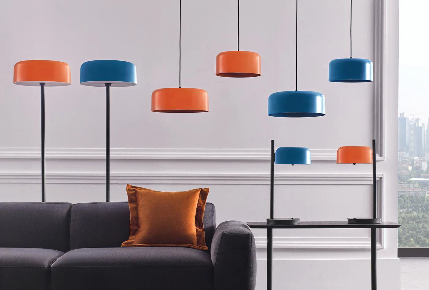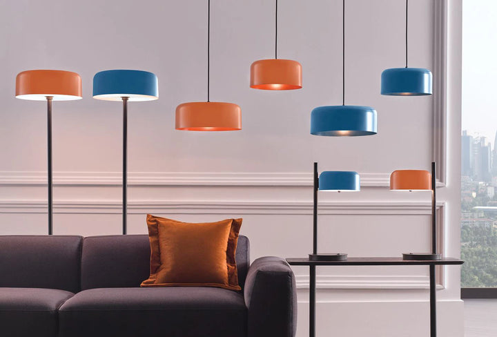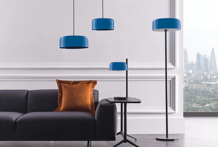 The GIO LAMP FAMILY's round, curved lampshade is modern in shape and available in blue, orange and mink grey. It is cheerful, yet very stylish, and will really brighten up the atmosphere of your home.