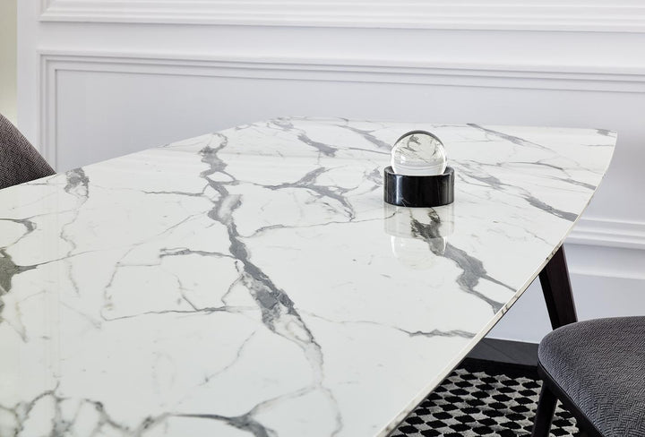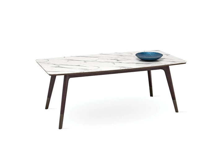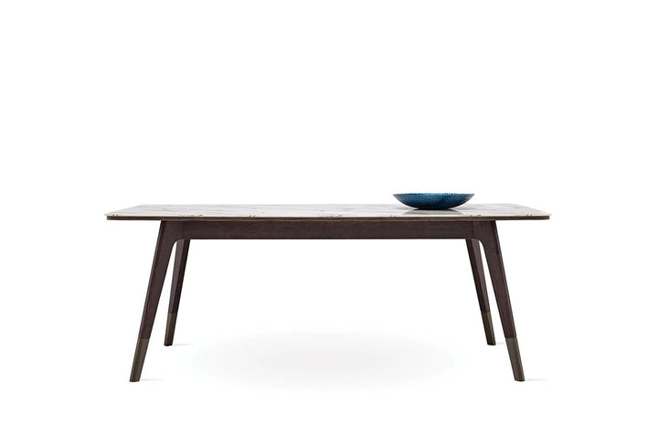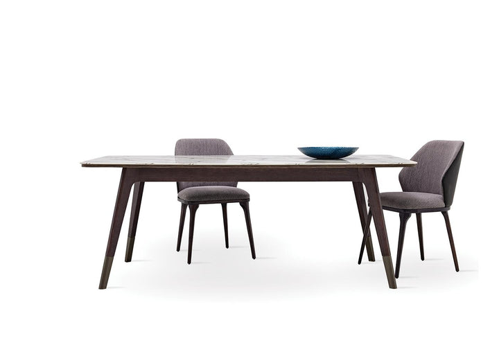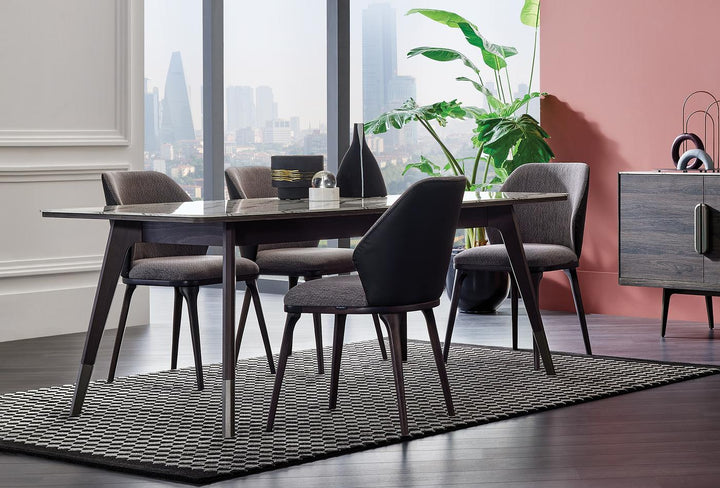 The GIORNO DINING TABLE, which stands out with its contemporary elegance, has a walnut-colored tabletop and legs complemented by marble-look surfaces.