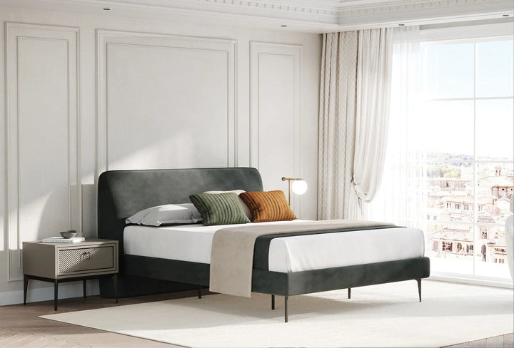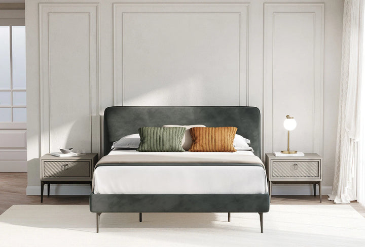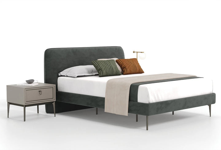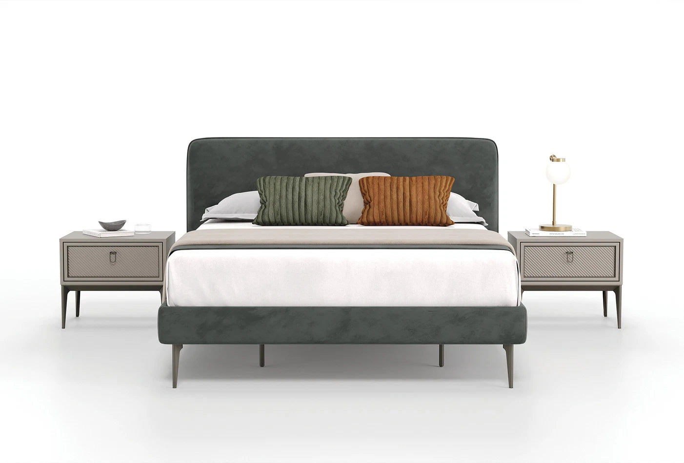 The HERA BEDDING SET offers a unique look with its fringed headboard, while its metal legs reinforce the modern design concept.