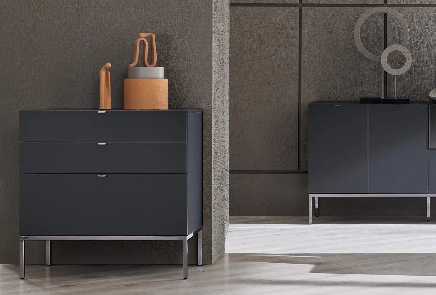 With its matte black surfaces, it creates maximum harmony with other furniture, its stylish shiny smoke black metal handles and shiny smoke black metal legs, and it also provides convenient storage.