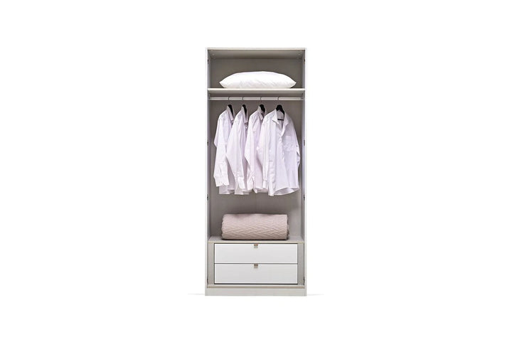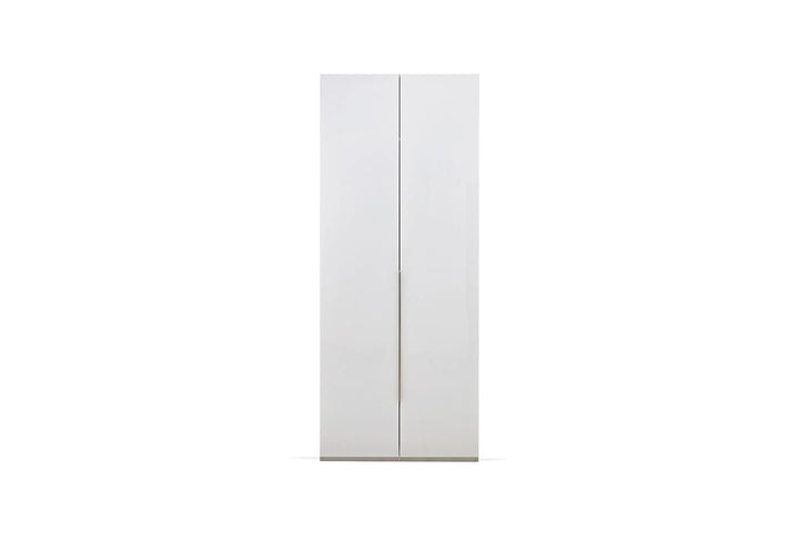 Emphasizing the monochrome style often preferred in home design, the LEGATO 2-DOOR WARDROBE emphasizes elegance with its long, shiny bronze-colored metal handles and glossy white surface, while promising functionality with ample storage space.