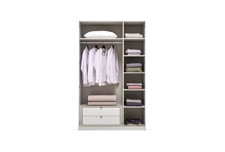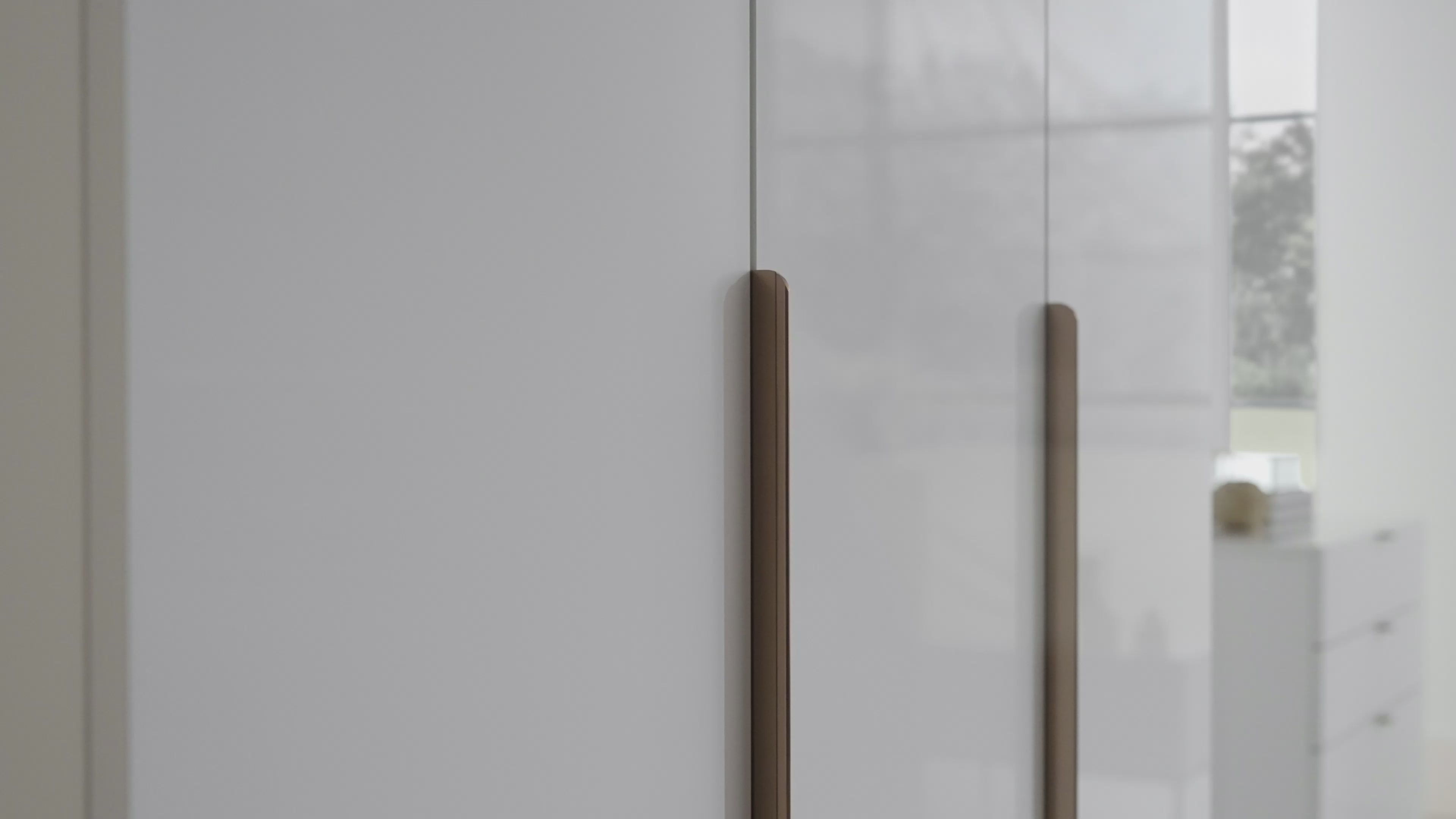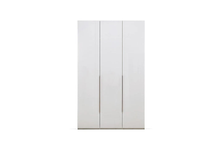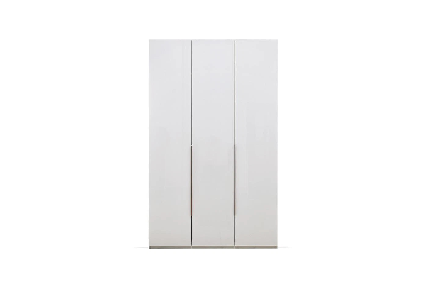 Emphasizing the monochrome style often preferred in home design, the LEGATO 3-DOOR WARDROBE emphasizes elegance with its long, shiny bronze-colored metal handles and glossy white surface, while promising functionality with ample storage space.
