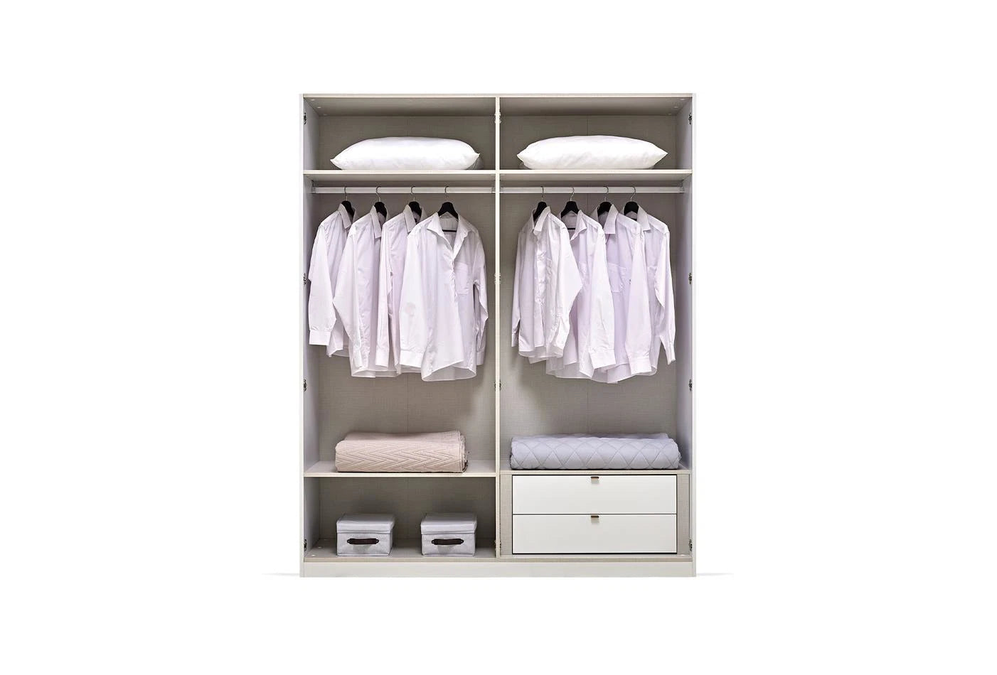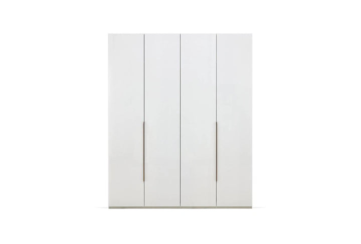 Emphasizing the monochrome style often preferred in home design, the LEGATO 4-DOOR WARDROBE emphasizes elegance with its long, shiny bronze-colored metal handles and glossy white surface, while promising functionality with ample storage space.
