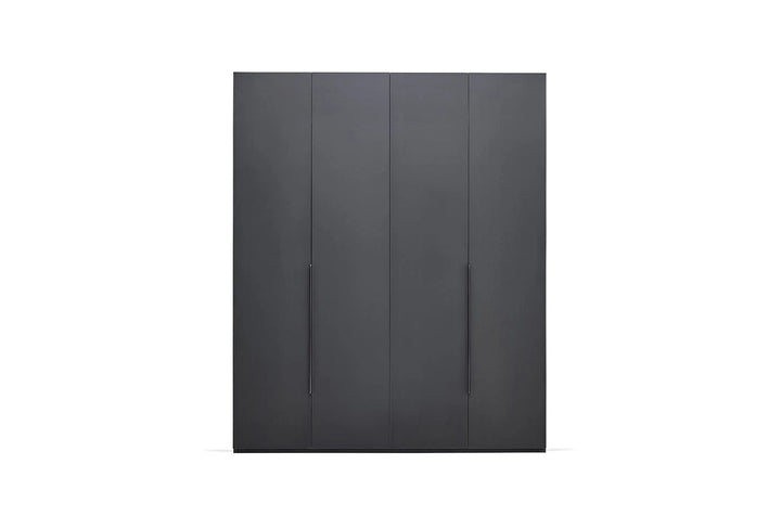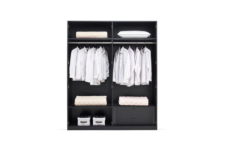 Emphasizing the monochrome style often preferred in home design, the LEGATO 4-DOOR WARDROBE emphasizes elegance with its long, shiny black metal handles and matte black surface, while promising functionality with ample storage space.