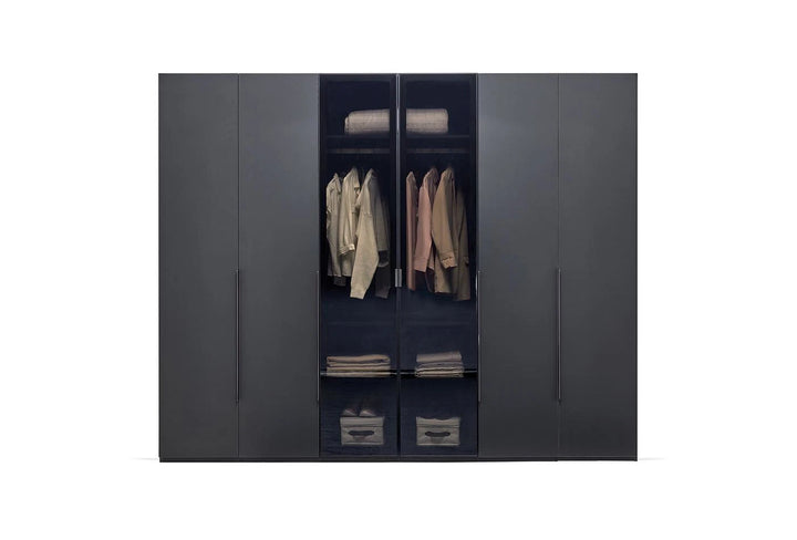 Emphasizing the monochrome style often preferred in home design, the LEGATO 6-DOOR WARDROBE emphasizes elegance with its long, shiny black metal handles and matte black surface, while promising functionality with ample storage space.