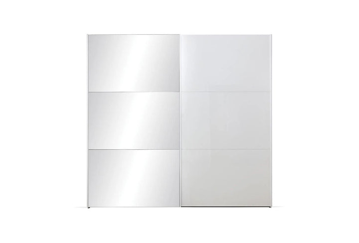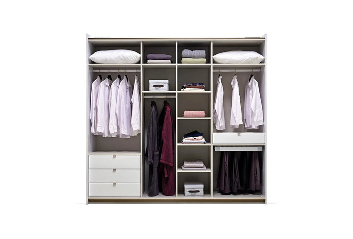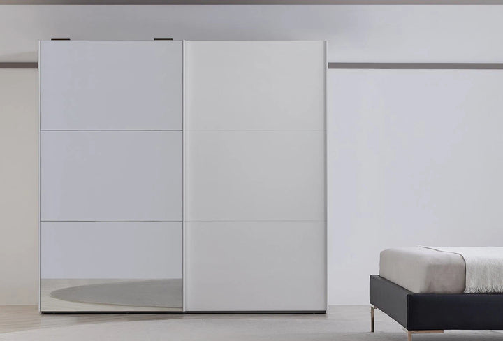 Emphasizing the monochrome style often preferred in home design, the LEGATO SLIDING DOOR WARDROBE emphasizes elegance with its long, shiny bronze-colored metal handles and glossy white surface, while promising functionality with ample storage space.