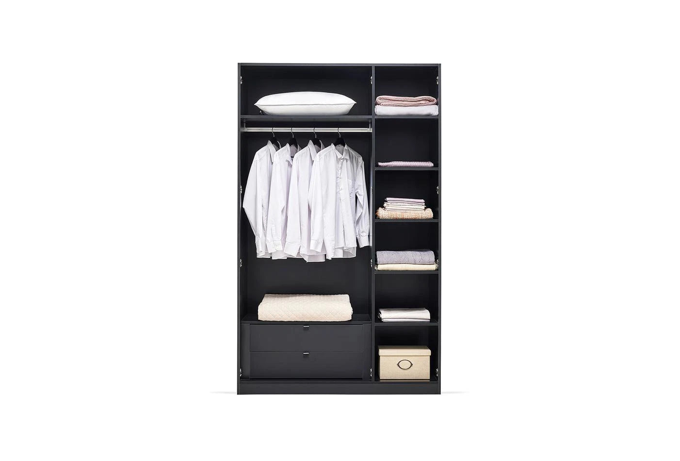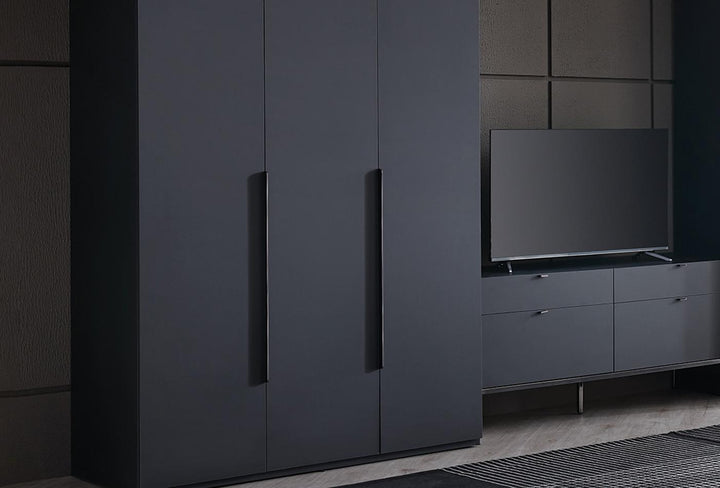 Emphasizing the monochrome style often preferred in home design, the LEGATO 3-DOOR WARDROBE emphasizes elegance with its long, shiny bronze-colored metal handles and glossy black surface, while promising functionality with ample storage space.