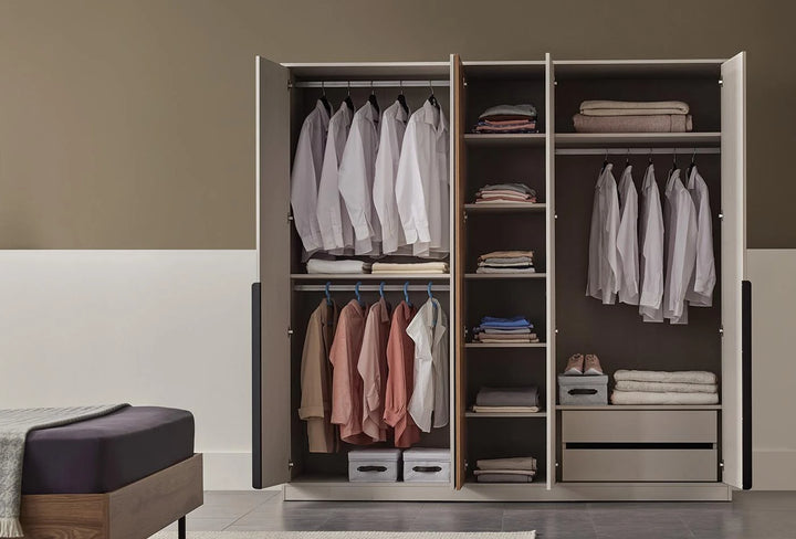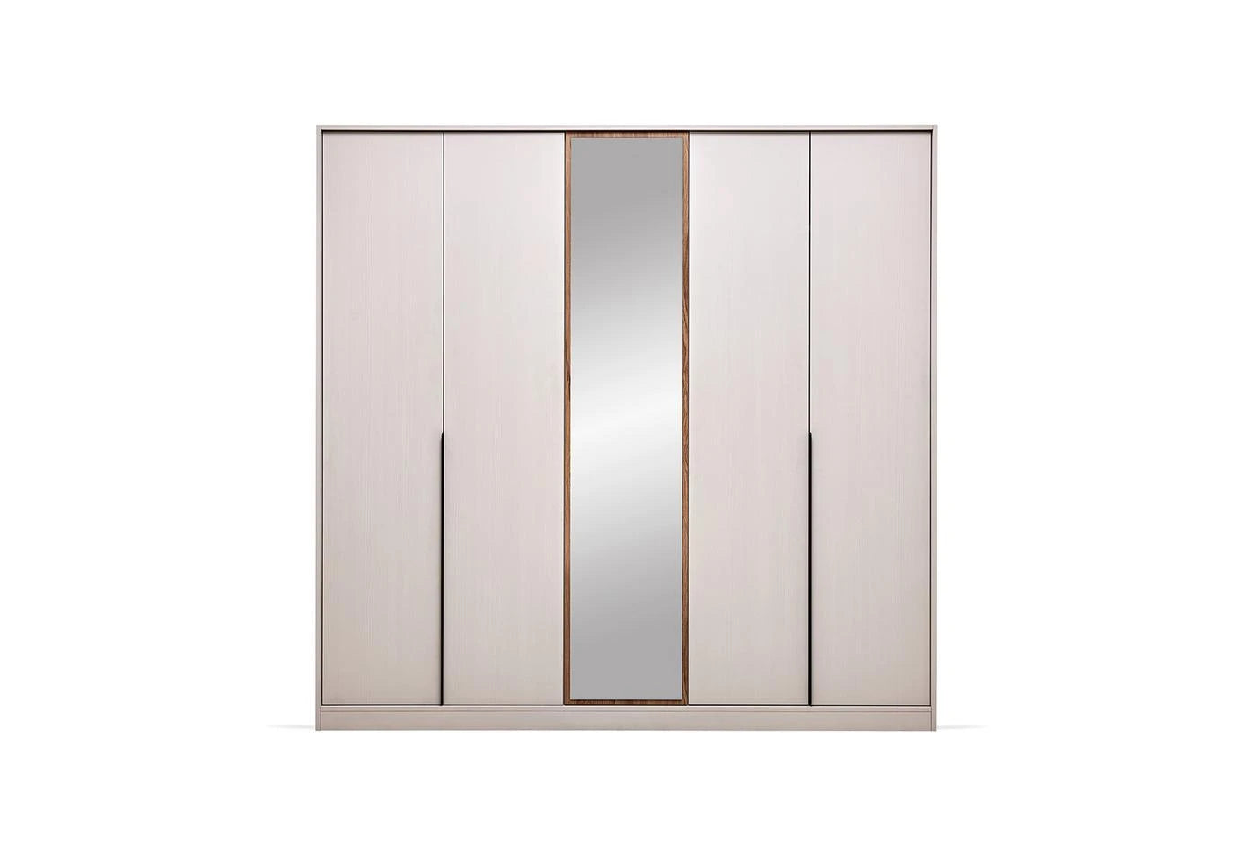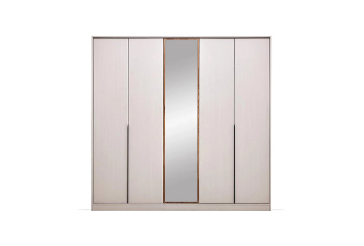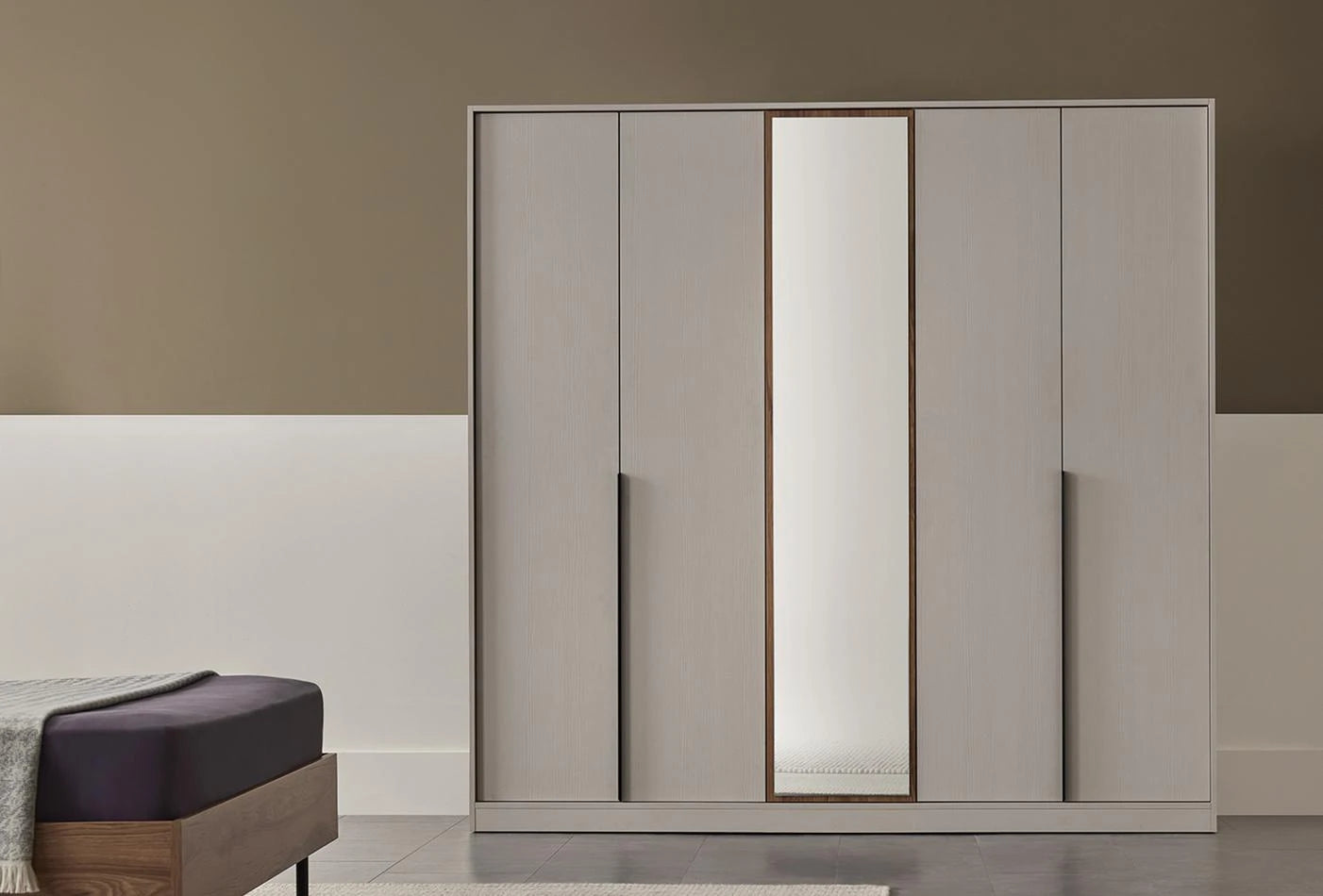 The LORETO 5-DOOR WARDROBE creates a very natural effect with its light walnut and off-white colors and deeply textured surfaces.