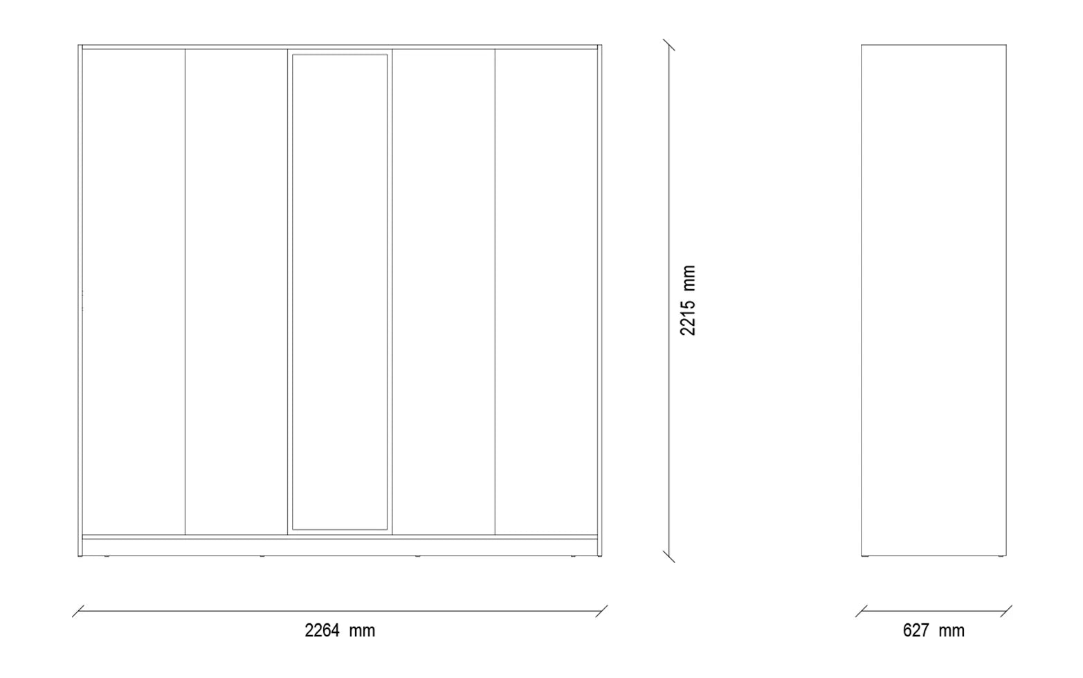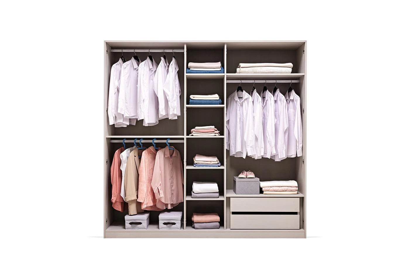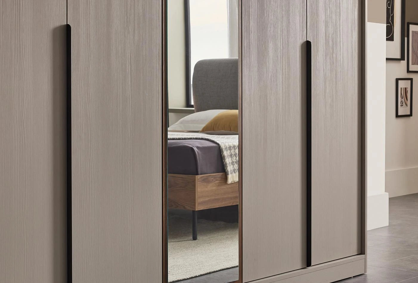 The LORETO 5-DOOR WARDROBE creates a very natural effect with its light walnut and off-white colors and deeply textured surfaces.