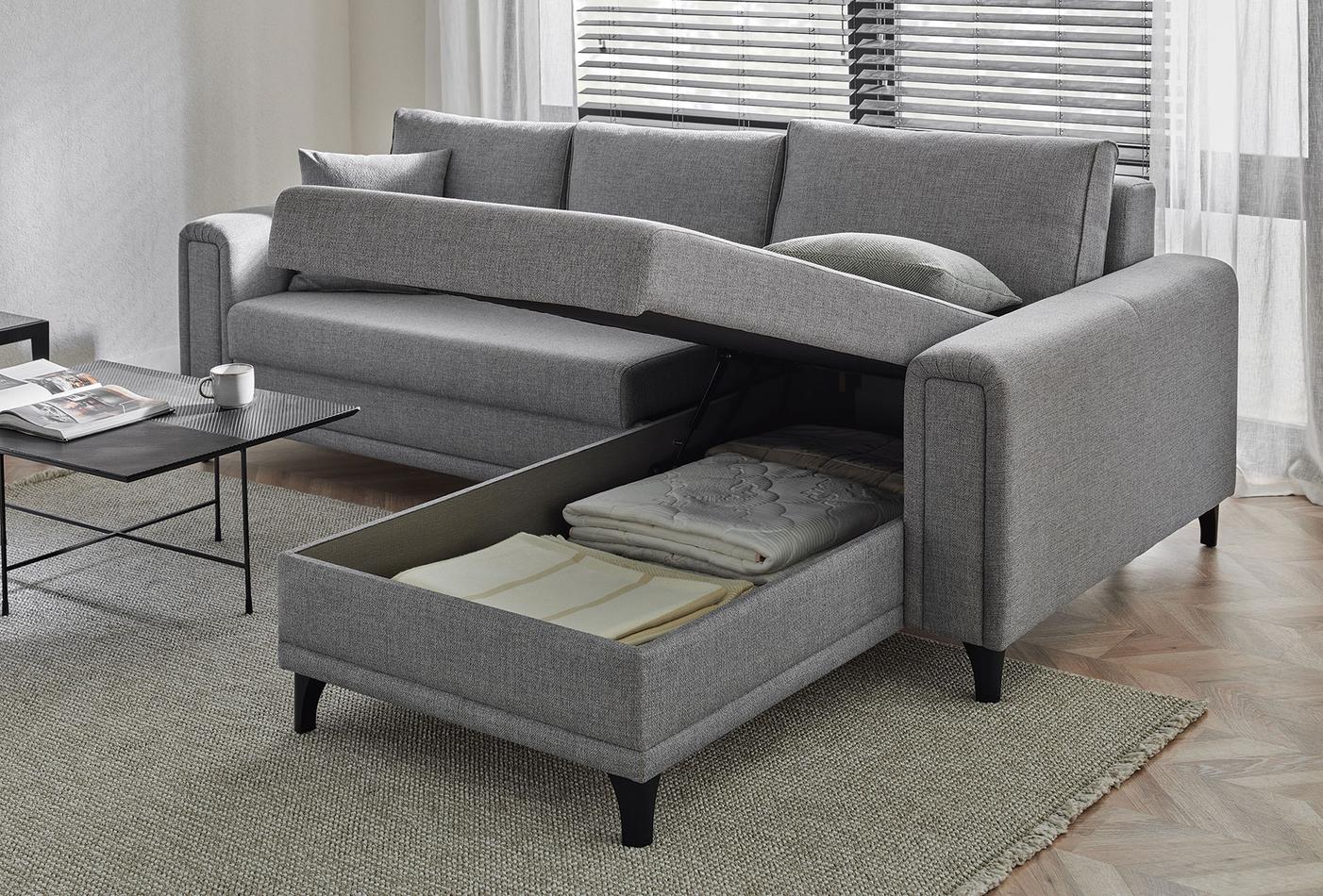 The MARIS sofa bed, which can be converted into a large bed, offers extra storage space thanks to the built-in linen holder as a design element.