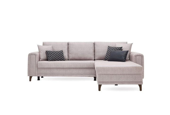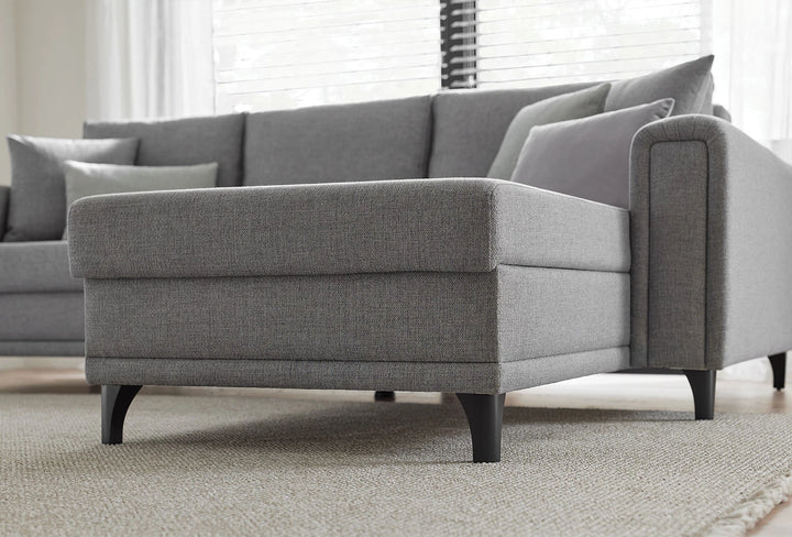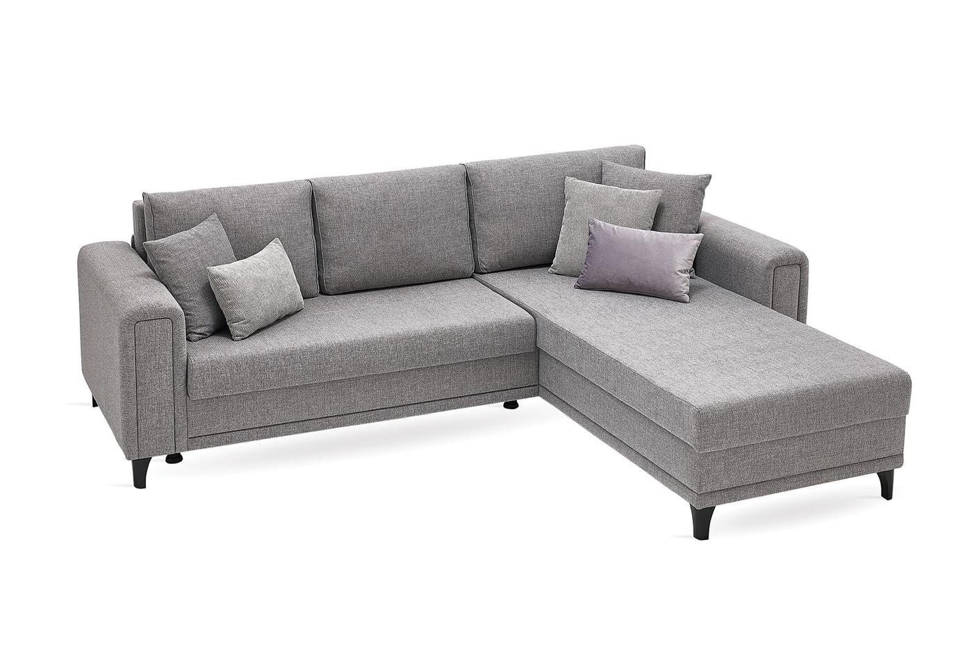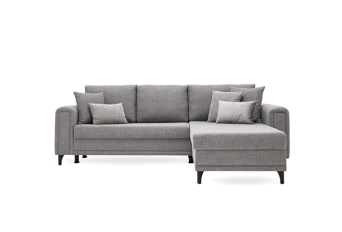 The MARIS L-shaped sofa stands out with its rich functions and impressive design. The color scheme of the set is enriched by five patterned and solid-colored decorative pillows.