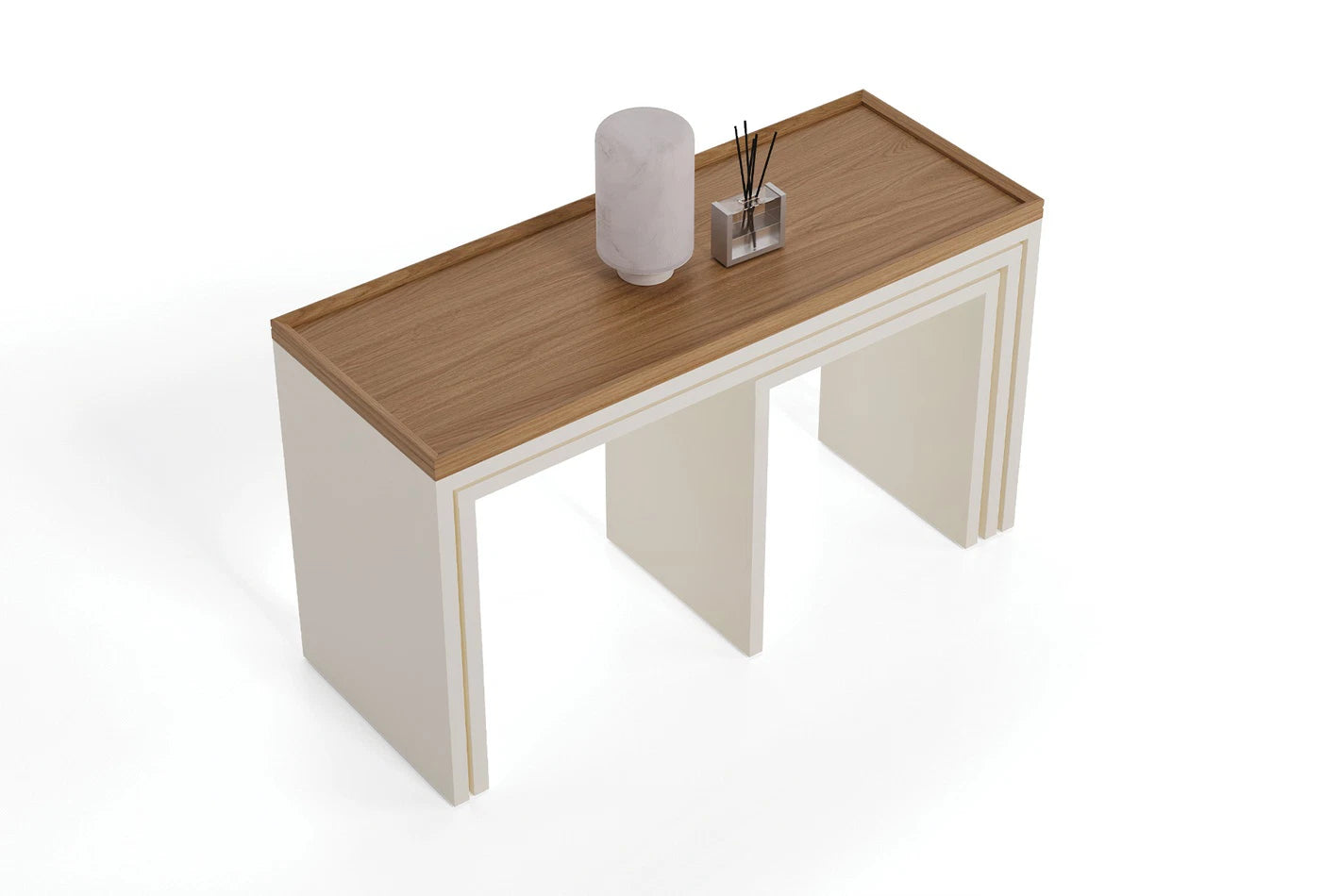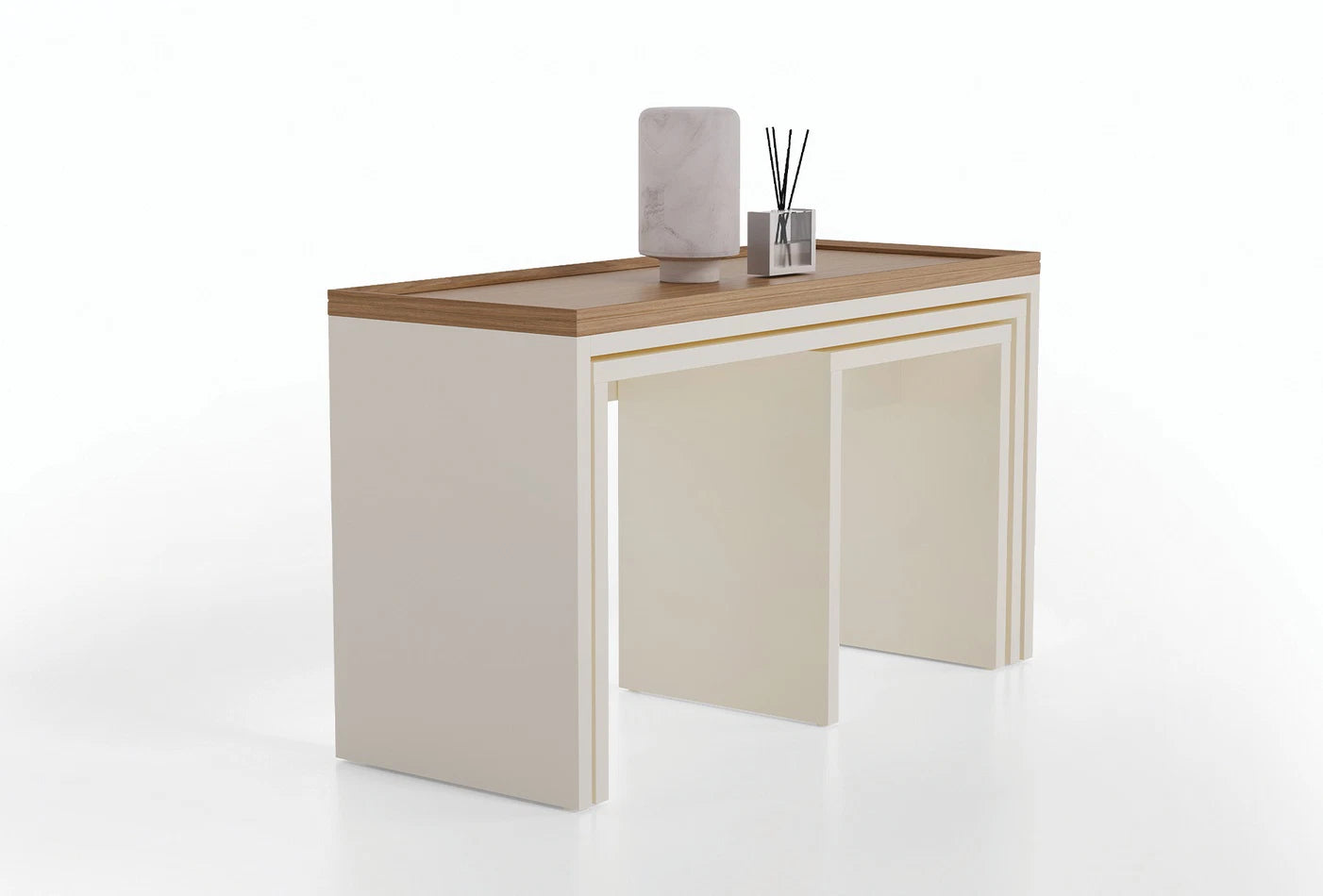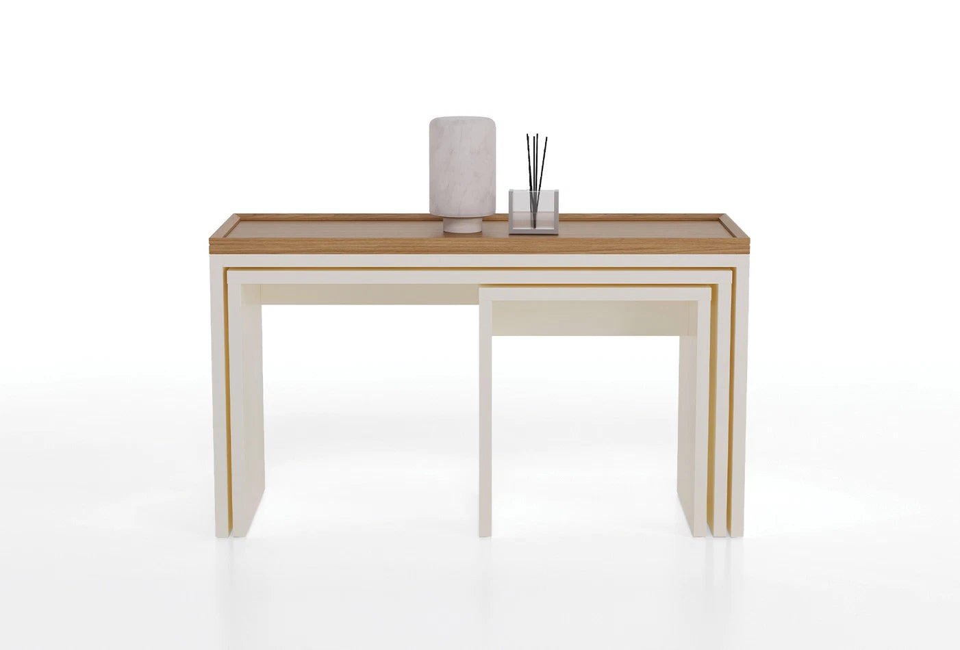 The MARSANA 3-SIZE SMOKING TABLE, with its wooden profile details and solid structure, draws attention with its harmony of oak and cream colors. Its modern design brings elegance to living spaces, while its functionality also offers practical use.