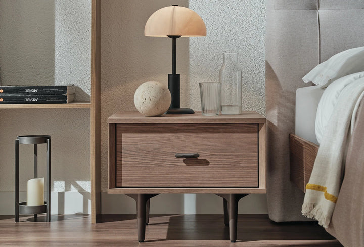 A unique combination of tranquility and warmth, the PALOMA NIGHTCARE, with its deep textured walnut color and metallic coffee brown handles and legs, creates a modern look, offering an aesthetic appearance in every aspect with its details.