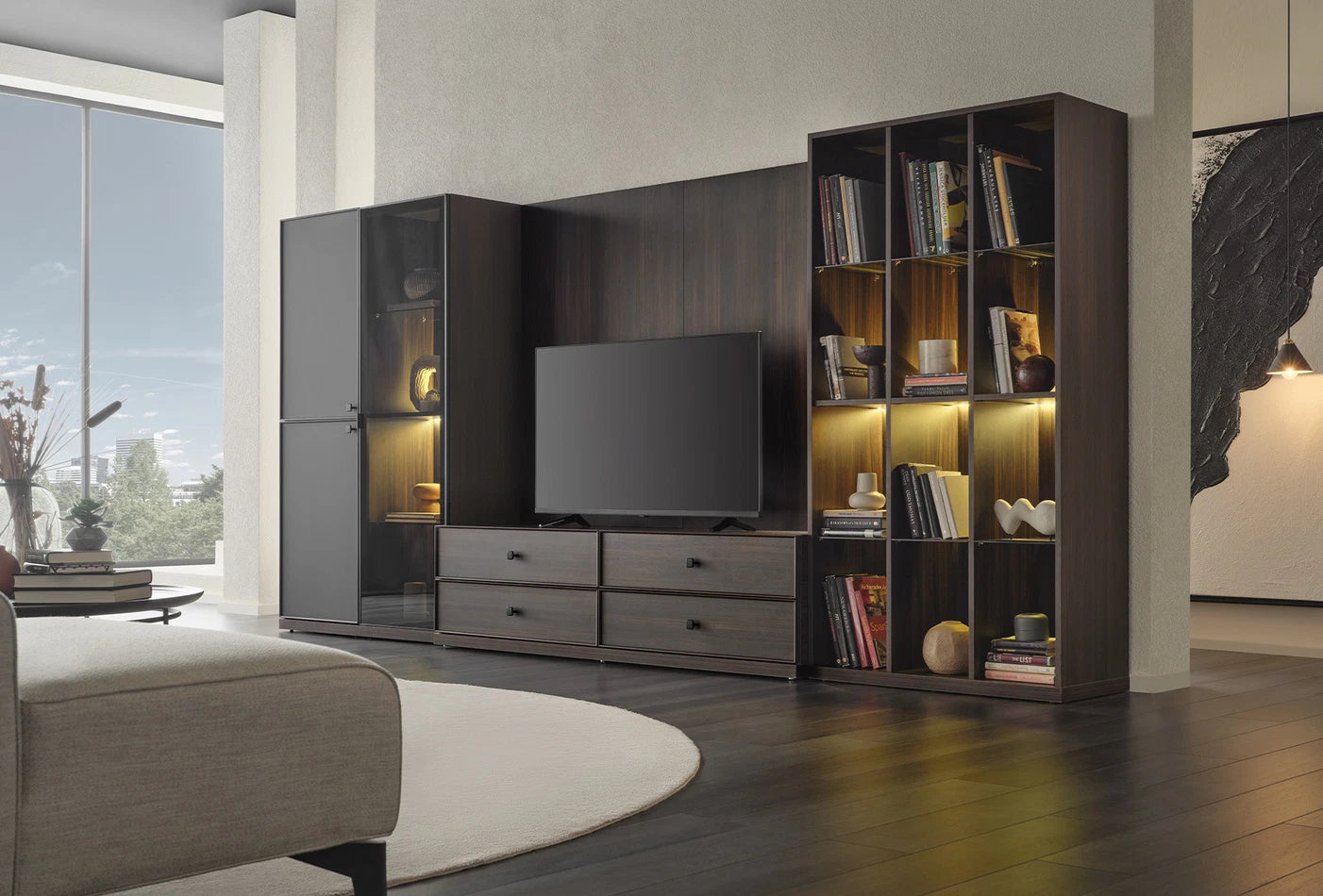 With its contemporary design and stylish details, the PARMA TV stand will add a unique touch to your living space. With its dark walnut finish and black metal handles, it is a practical and useful choice.
