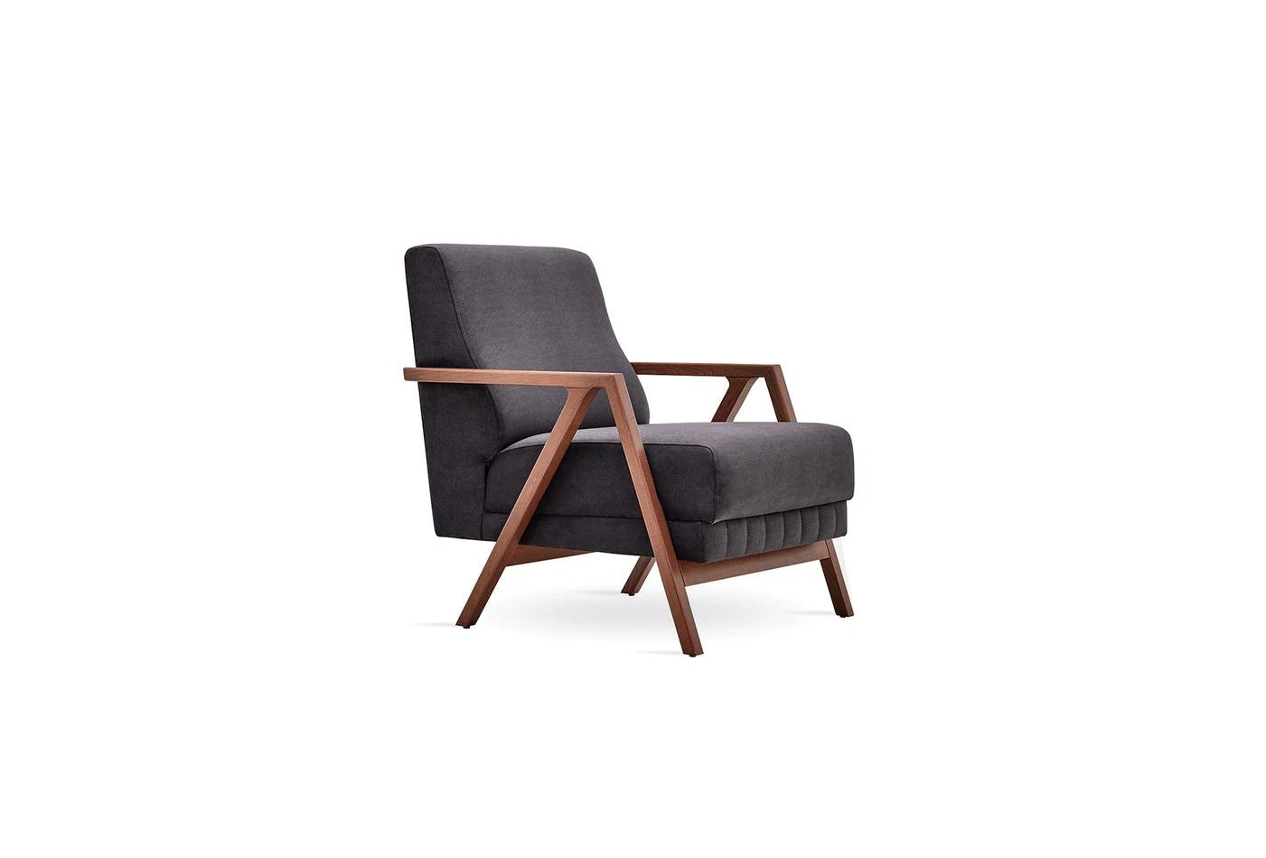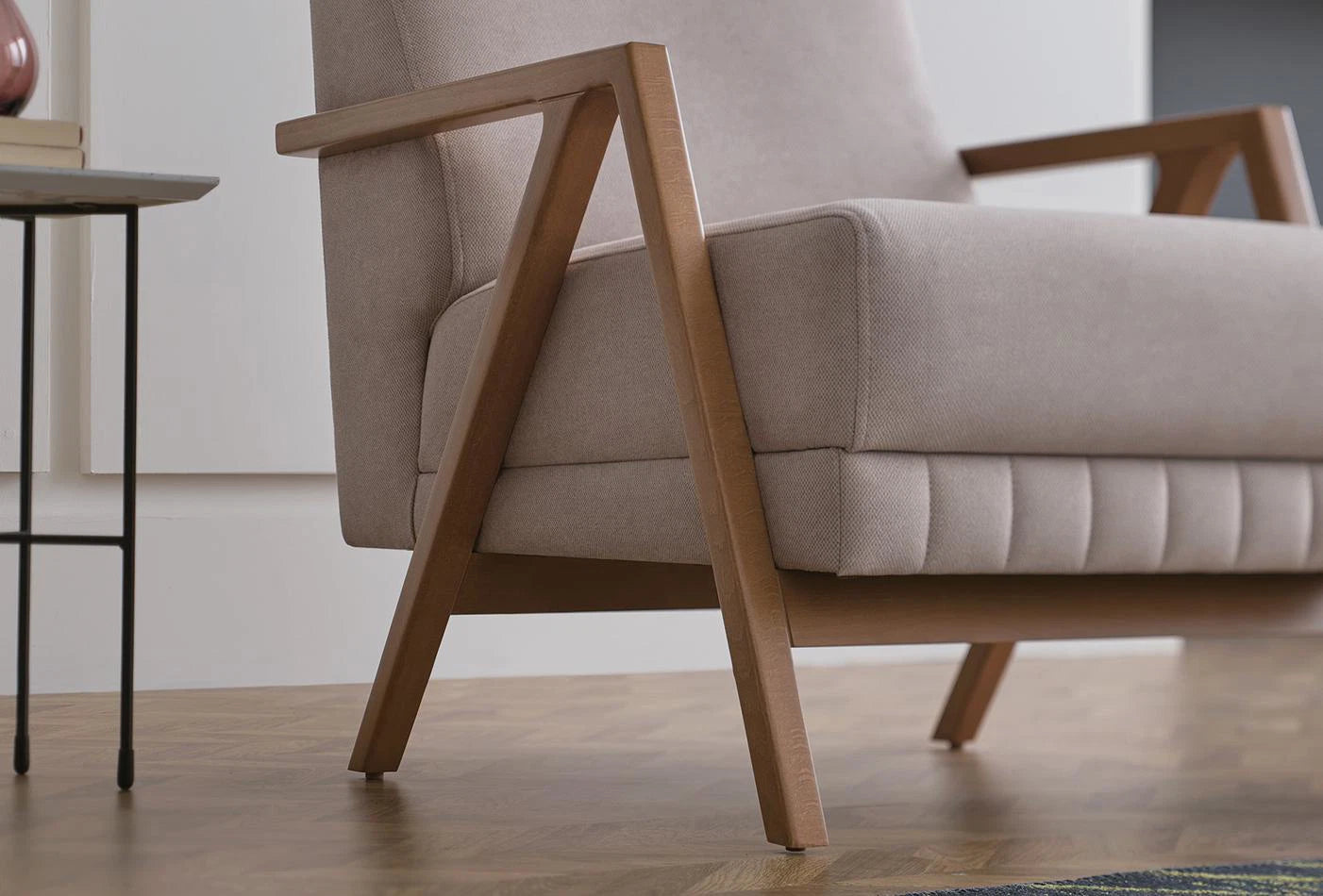 The 3 different wooden leg and armrest versions: walnut, oak and anthracite gray, the thick fabric upholstery and the eye-catching stitching solutions give the design a stylish look.