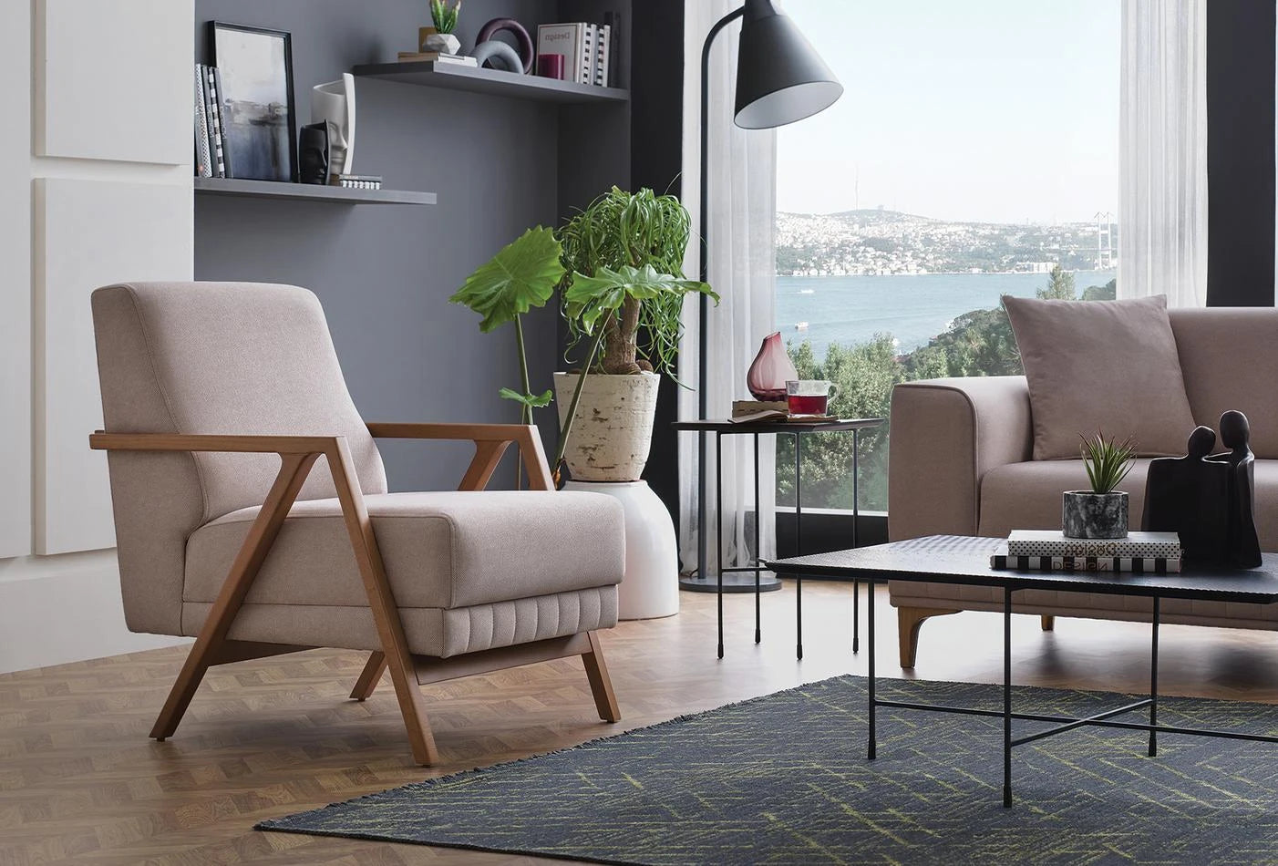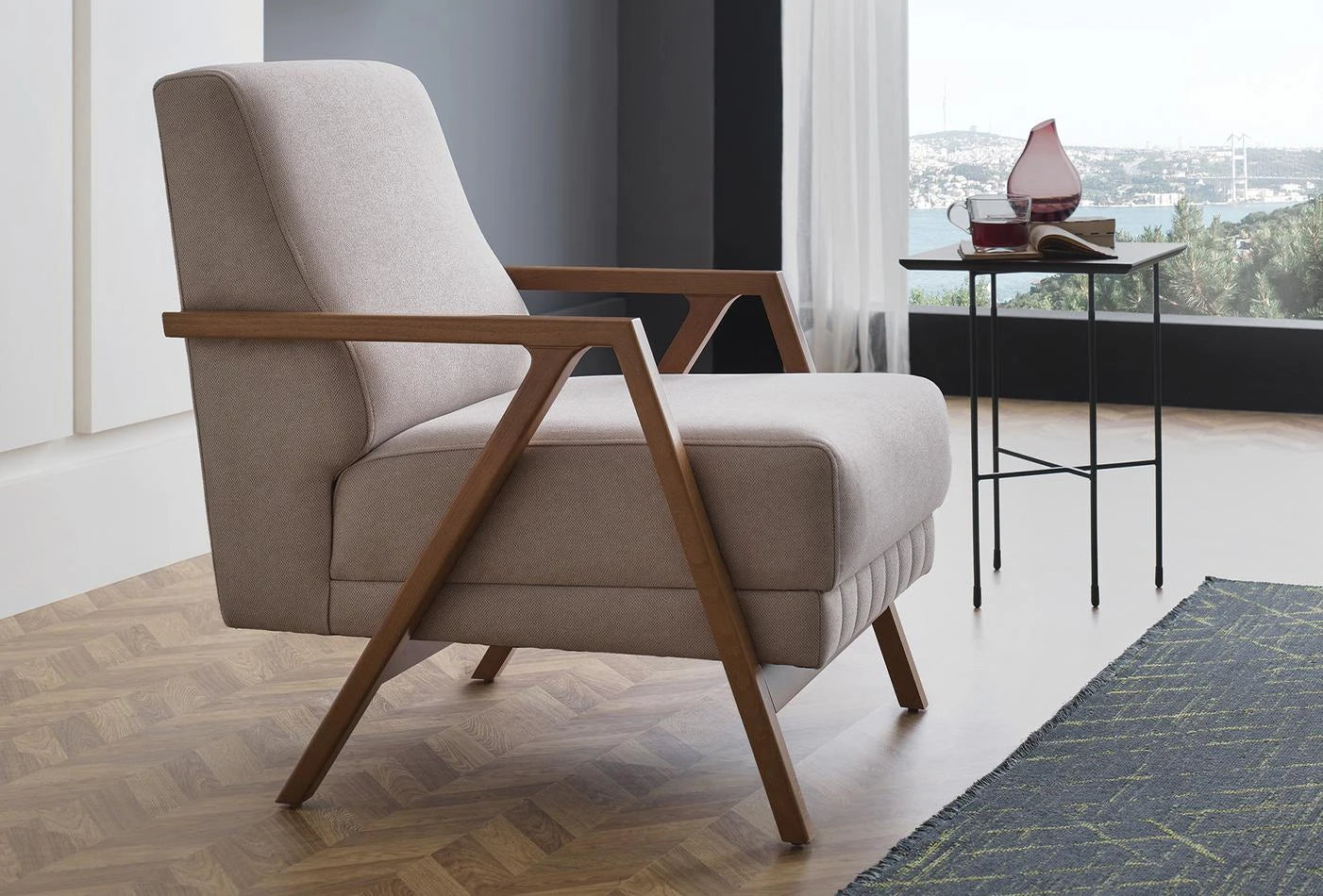The PAVIA ARMCHAIR, which perfectly combines comfort and modern design, provides outstanding comfort. It stands out with its comfortable backrest and elegantly contoured wooden armrests.