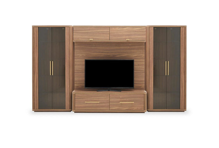 In addition to the two TV stand alternatives with plinths and legs in different sizes and shapes, a bookshelf, upper cabinet and display cabinet are also available, allowing for different combinations.
