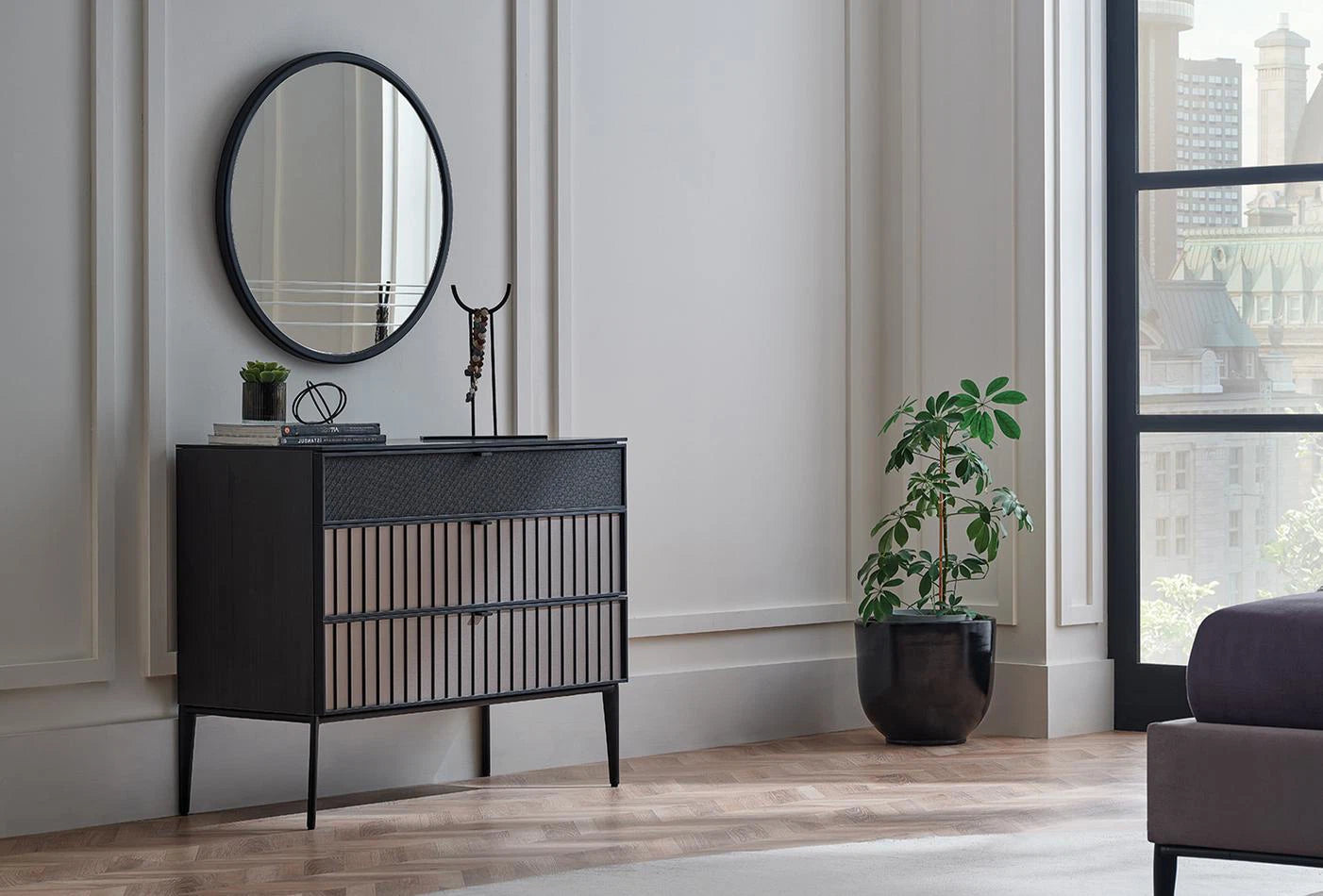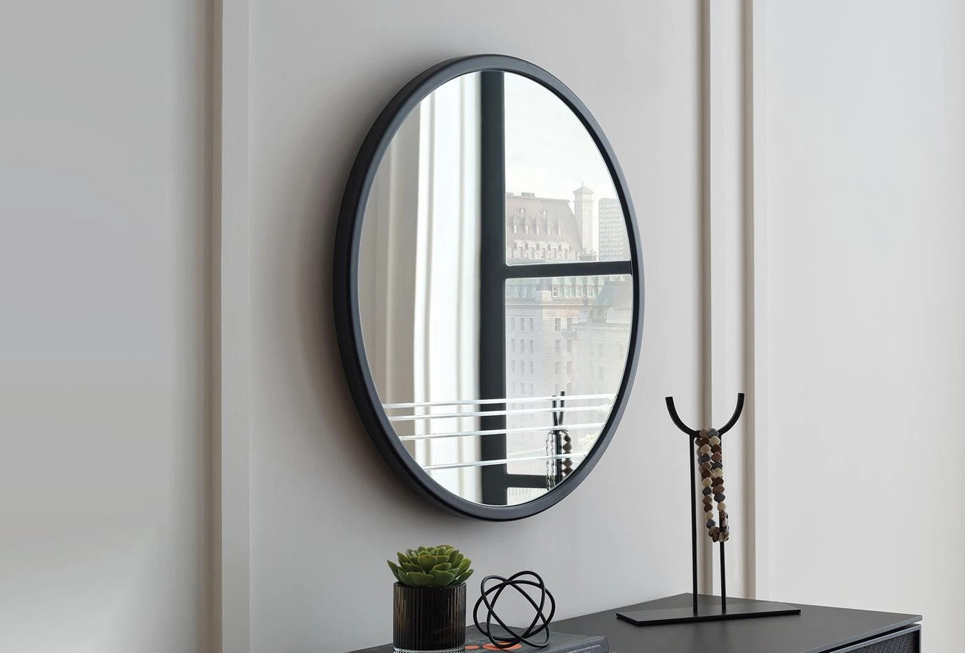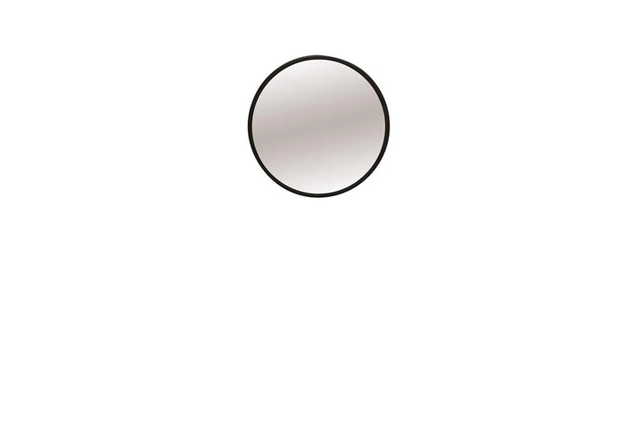 Its matte black frame and round shape make it a great addition to any space. The natural-colored mirror and simple design are clean and elegant.