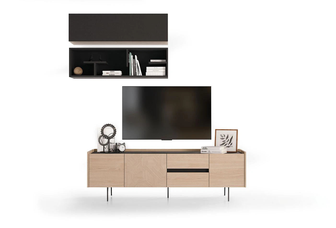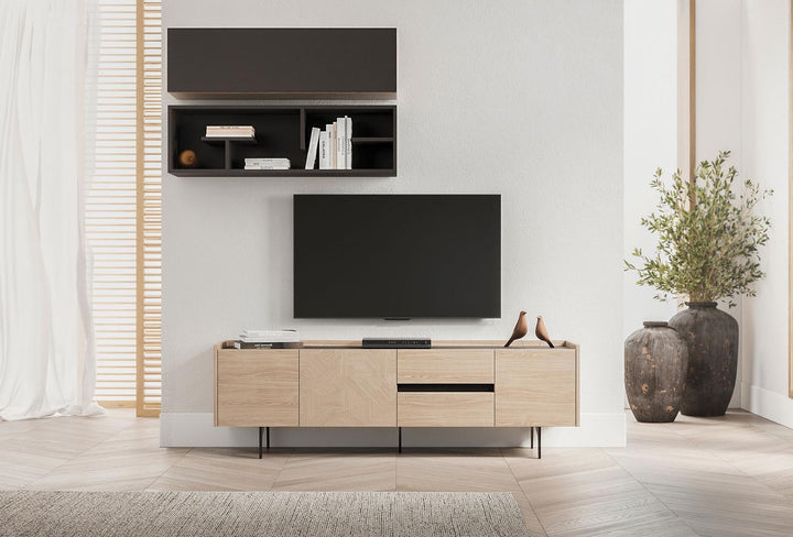 The light oak and anthracite color combination gives the cabinet a natural look.