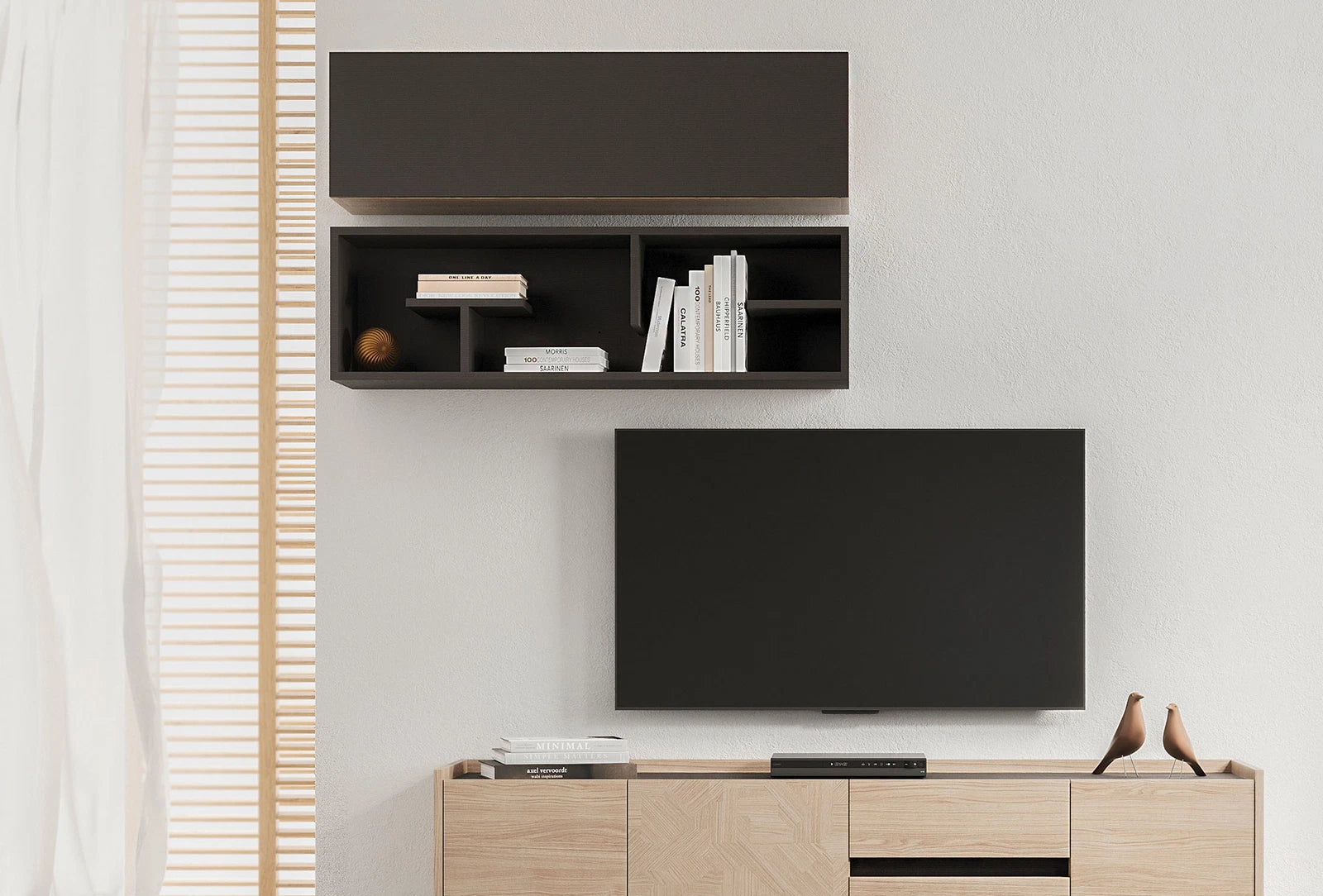 Its contemporary and clean design makes the Terra shelf cabinet ideal for interiors of various styles. The bookshelf module, which can be used for decorative purposes, gives the cabinet a sophisticated look.