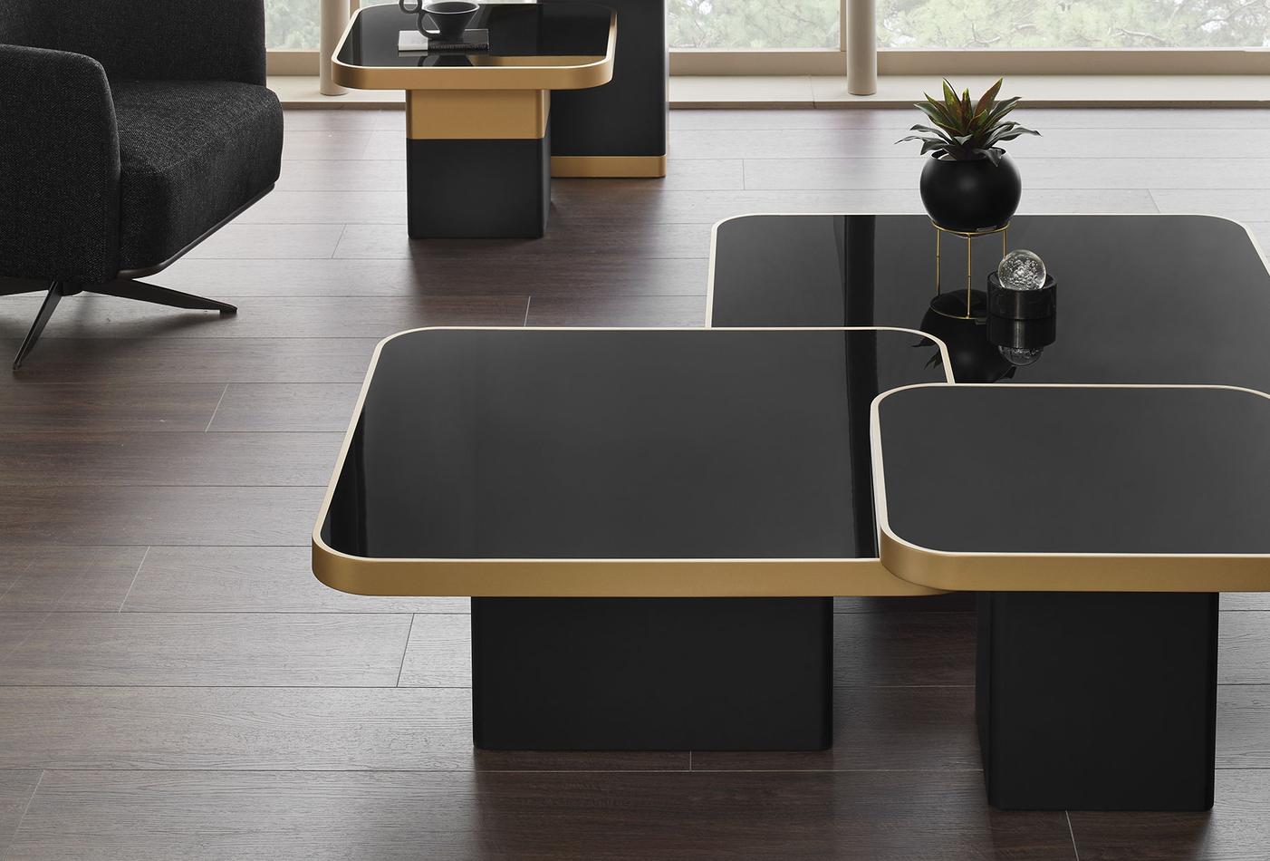 Drawing inspiration from modern design, the VALIO SMOKING TABLE combines a black top with gold details to bring an elegant touch to living spaces. Offering five different size alternatives to suit your needs, the VALIO SMOKING TABLE SERIES perfectly reflects the elegance of geometric design details.