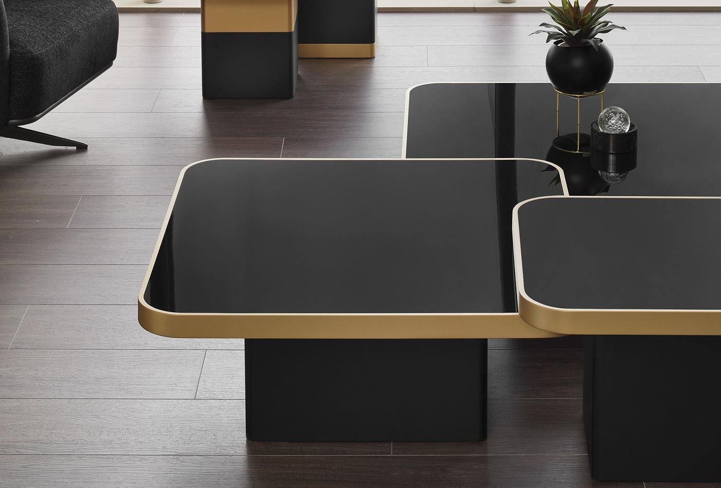 Drawing inspiration from modern design, the VALIO SMOKING TABLE combines a black top with gold details to bring an elegant touch to living spaces. Offering five different size alternatives to suit your needs, the VALIO SMOKING TABLE SERIES perfectly reflects the elegance of geometric design details.