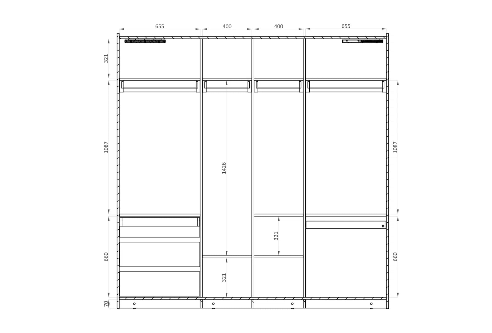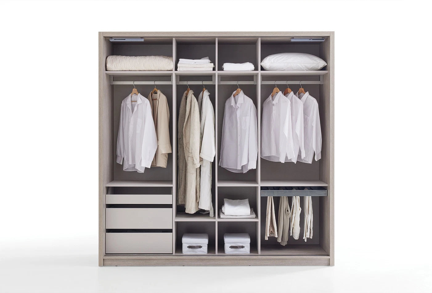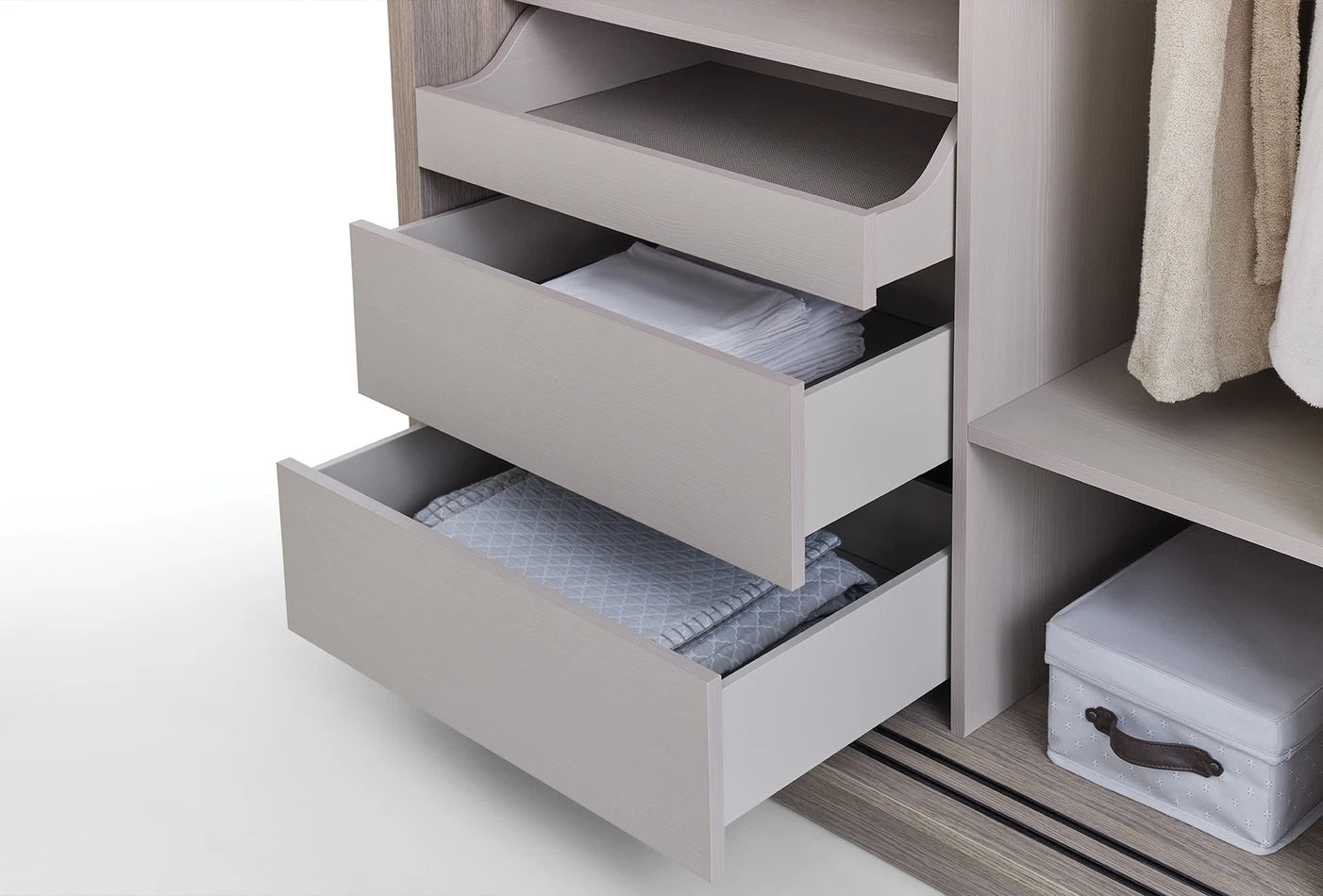 The Varena sliding door wardrobe creates an aesthetic layout with its special angled geometric shape and motion-sensing lighting.