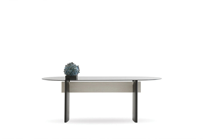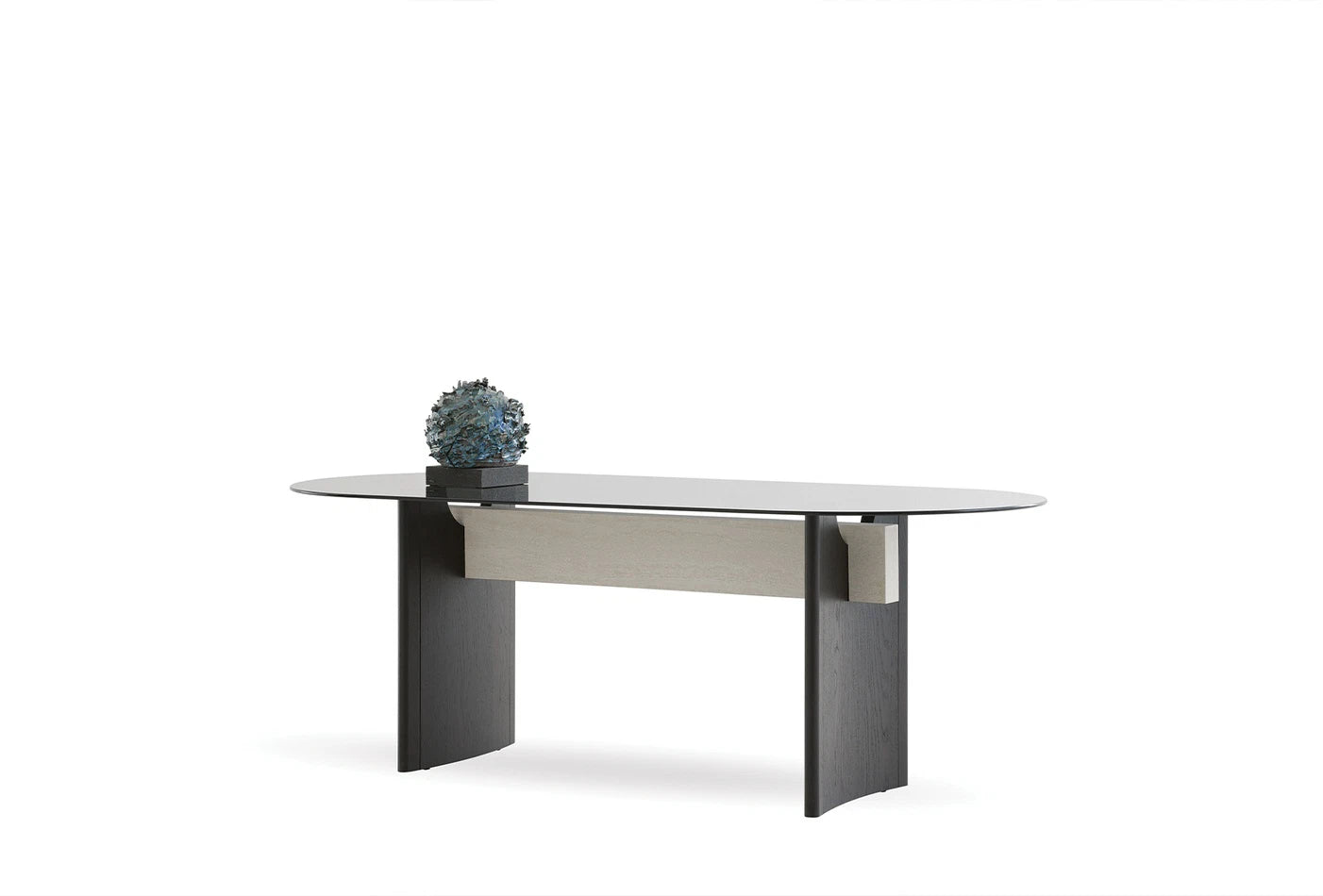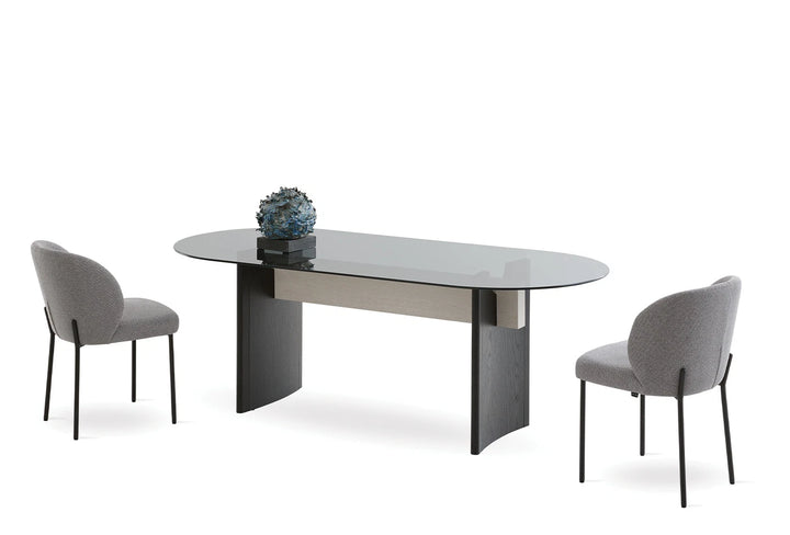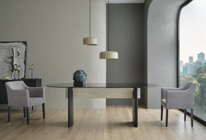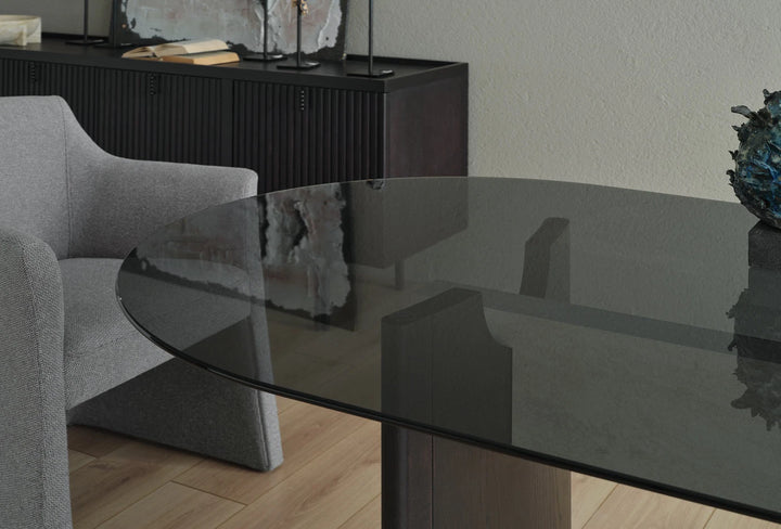 A felső felületen található füstszínű üveg elegáns érintést kölcsönöz az asztalnak. Ezenkívül az AUSTIN ÉTKEZŐASZTAL hat-nyolc személyes ülőkapacitással rendelkezik, és ellipszis formájával illeszkedik az étkezőkhöz.