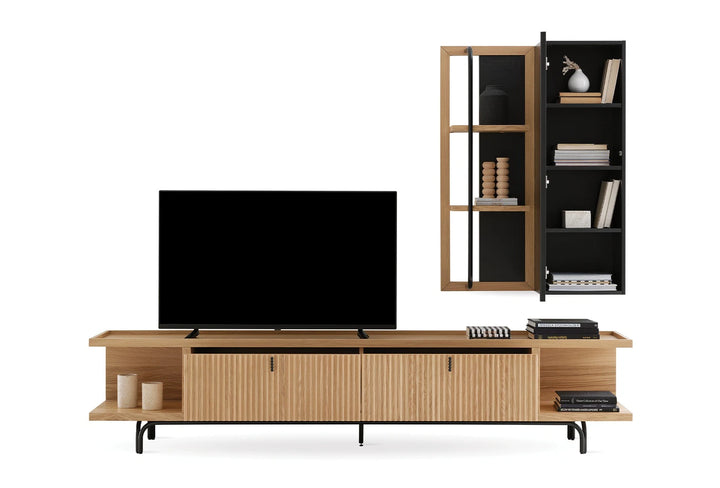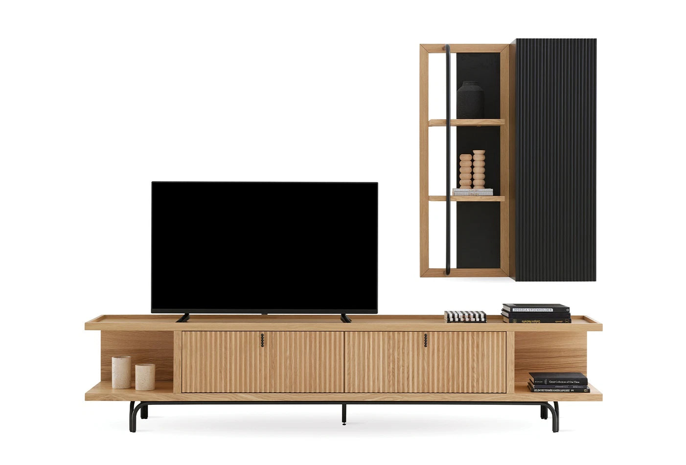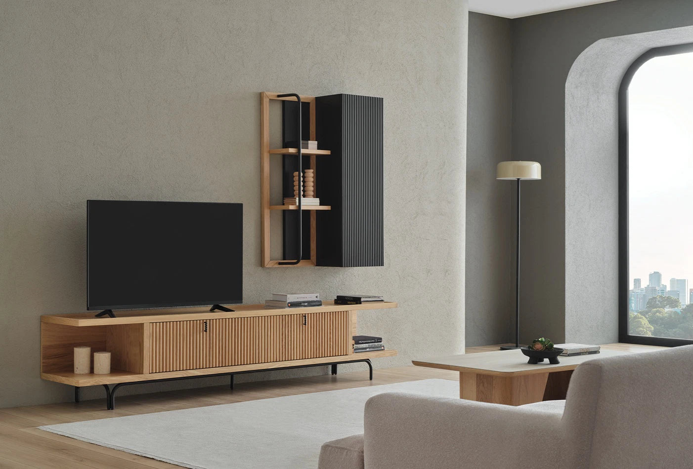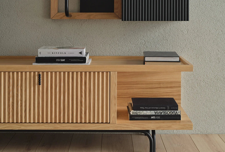 A felső felületen található MDF-en tölgyfa furnér részlet erősíti a szekrény természetes megjelenését. Ezenkívül a fekete fém lábak és a minimalista fogantyú design letisztult stílust kölcsönöz a szekrénynek.