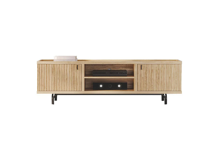 Az Austin Tv Állvány kidolgozott részleteivel elegáns érintést kölcsönöz az élettereknek. Letisztult esztétikájával az Austin Tv Állvány minimalista fekete fém fogantyú dizájnjának köszönhetően lenyűgöző látványt nyújt. A felső felületen lévő MDF-en tölgy furnér alkalmazása erősíti az állvány természetes megjelenését.