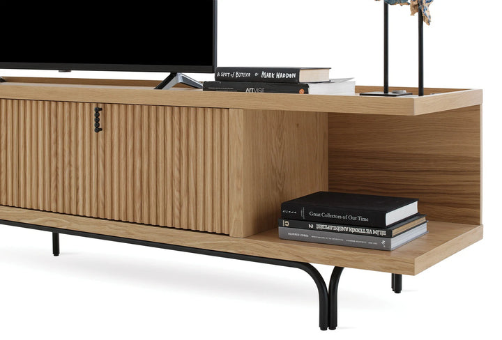 A felső felületen lévő MDF-en tölgy furnér alkalmazása erősíti az állvány természetes megjelenését.