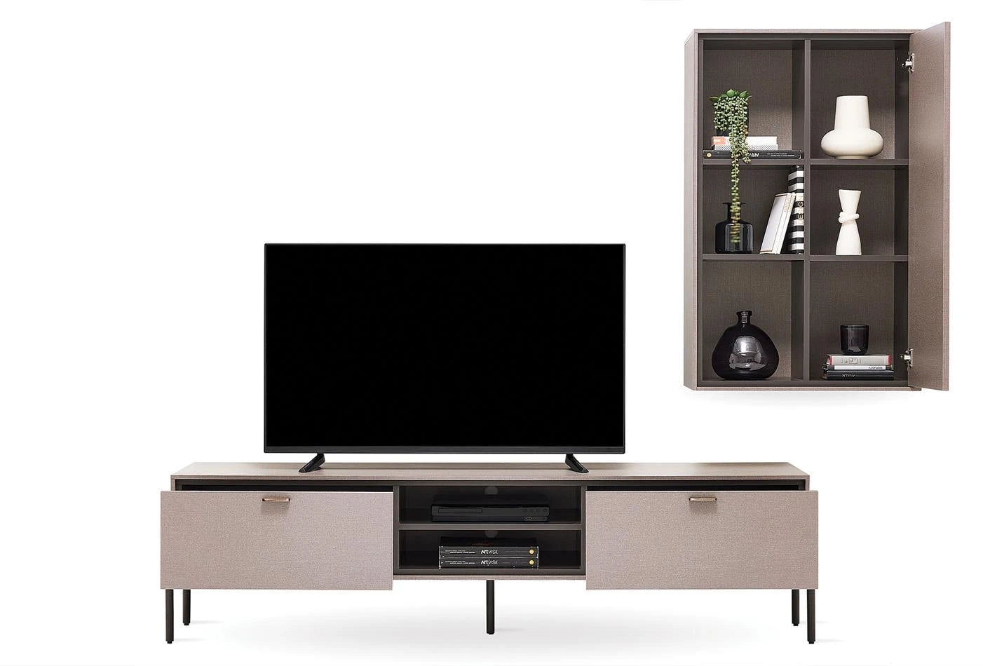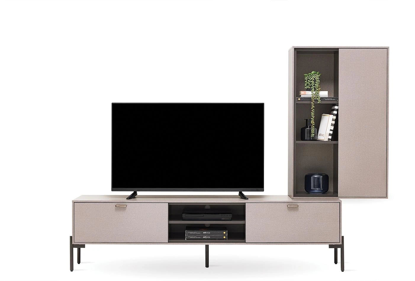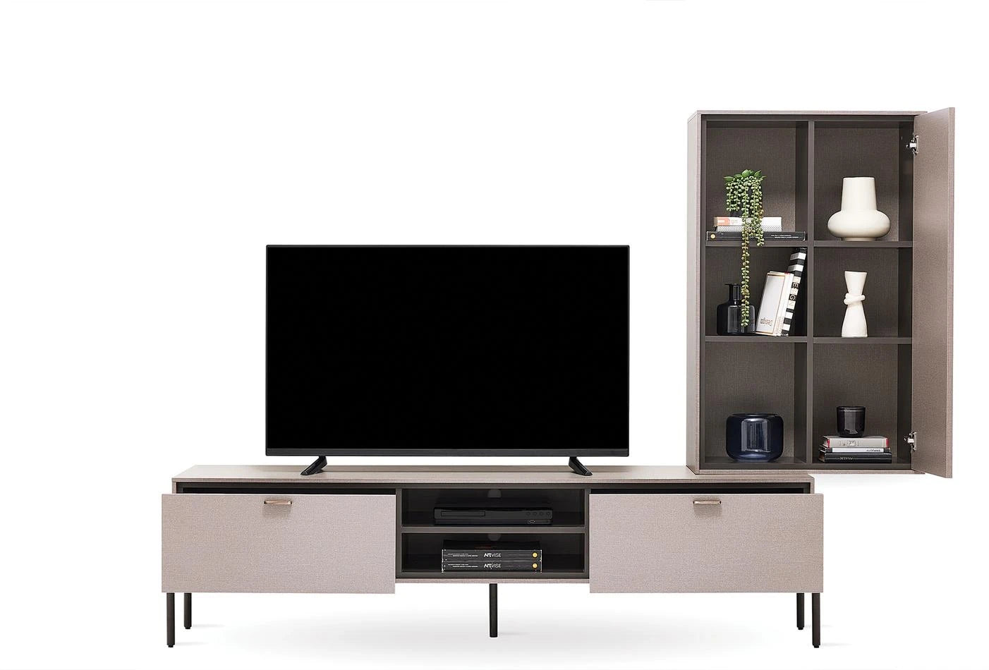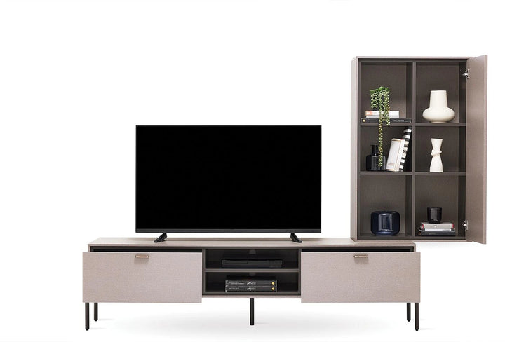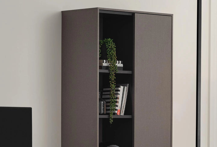 A sokoldalú funkcionalitást a minőségi dizájnnal ötvöző BERTA POLCOS SZEKRÉNYSOR-nak eredeti és kifinomult megjelenést kölcsönöz az Enza Home különleges textil hatású felületeinek alkalmazása, míg antik bronz színű fém fogantyúi esztétikusak és funkcionálisak.
