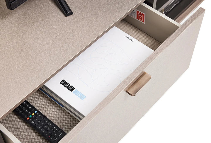A fával és üveggel kombinált polcos részen kívül a 2 fiók extra tárolási lehetőséget nyújt.