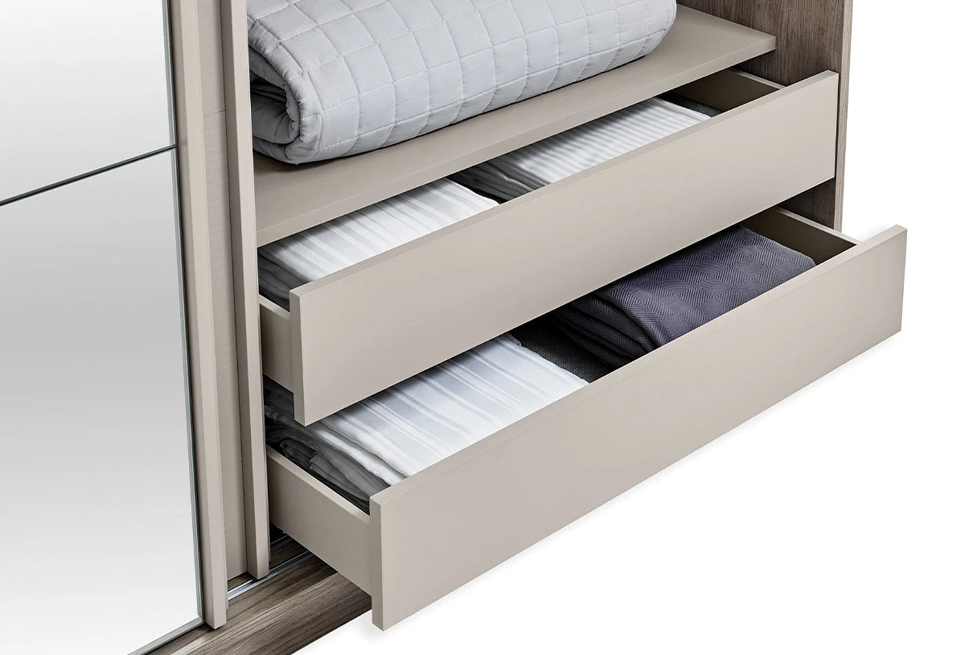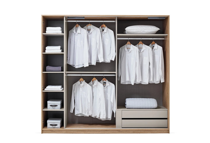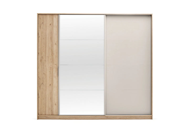 A Cante tolóajtós gardróbszekrény a modern és minimalista dizájnfelfogást a természetes tölgy és bézs színkombinációval ötvözi. A fedeleken lévő speciális csíkos textúrák és natúr színű tükrök friss és elegáns atmoszférát kölcsönöznek hálószobájának.