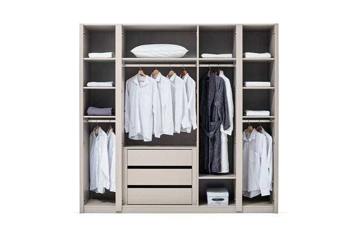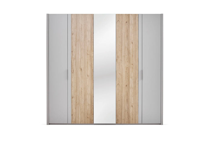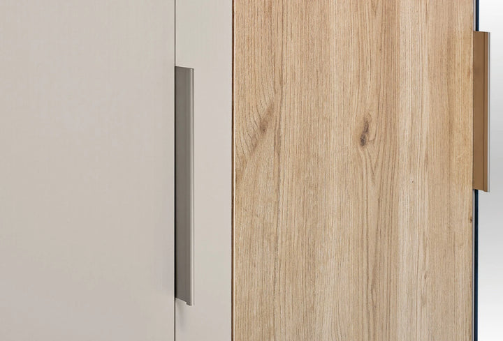 Modern dizájnelemekkel figyelemre méltó Cante 5 ajtós gardróbszekrény, természetes tölgy és bézs színkombinációjával meleg és elegáns atmoszférát kölcsönöz hálószobáinak.