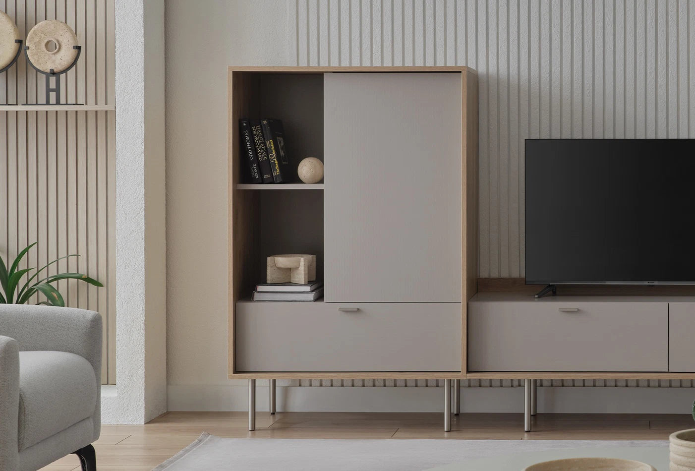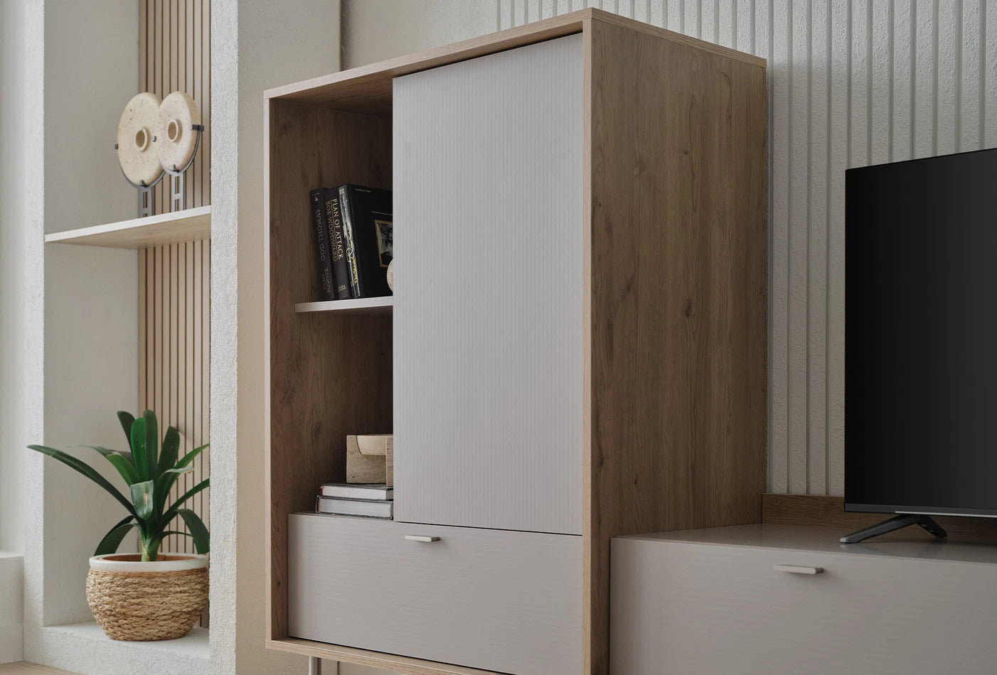 Természetes tölgy és bézs színkombinációja elegáns meleget kölcsönöz a térnek, miközben esztétikai szempontból is egyensúlyt biztosít. A moduláris TV állvány elrendezése rugalmasságot és személyre szabási lehetőséget biztosít a felhasználóknak.