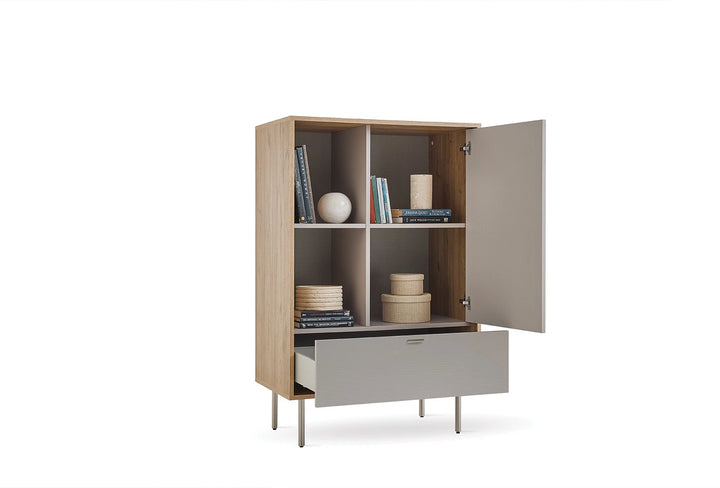 A fedeleken lévő speciális csíkos textúra alkalmazása kifinomult érintést ad a dizájnnak, míg az 1 db fiók és fedél használata tárolóhelyet biztosít, megkönnyítve a rendszerezést. Az inox fém fogantyú és láb dizájn modern részletekkel elegáns kiegészítővé válik.