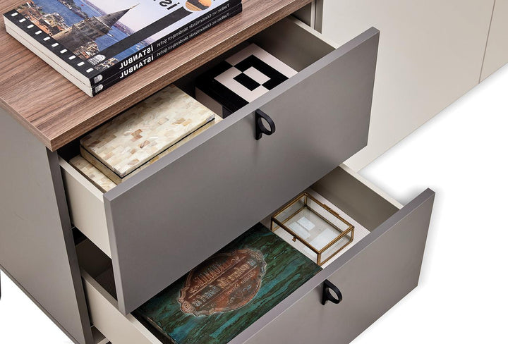A dió, szürke és törtfehér színek kombinációjával létrejövő lágy színátmenetek dinamikus és kortárs megjelenést biztosítanak a tereknek.