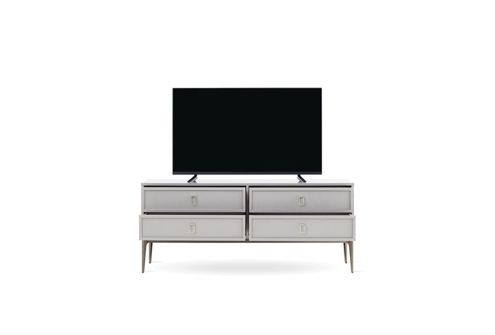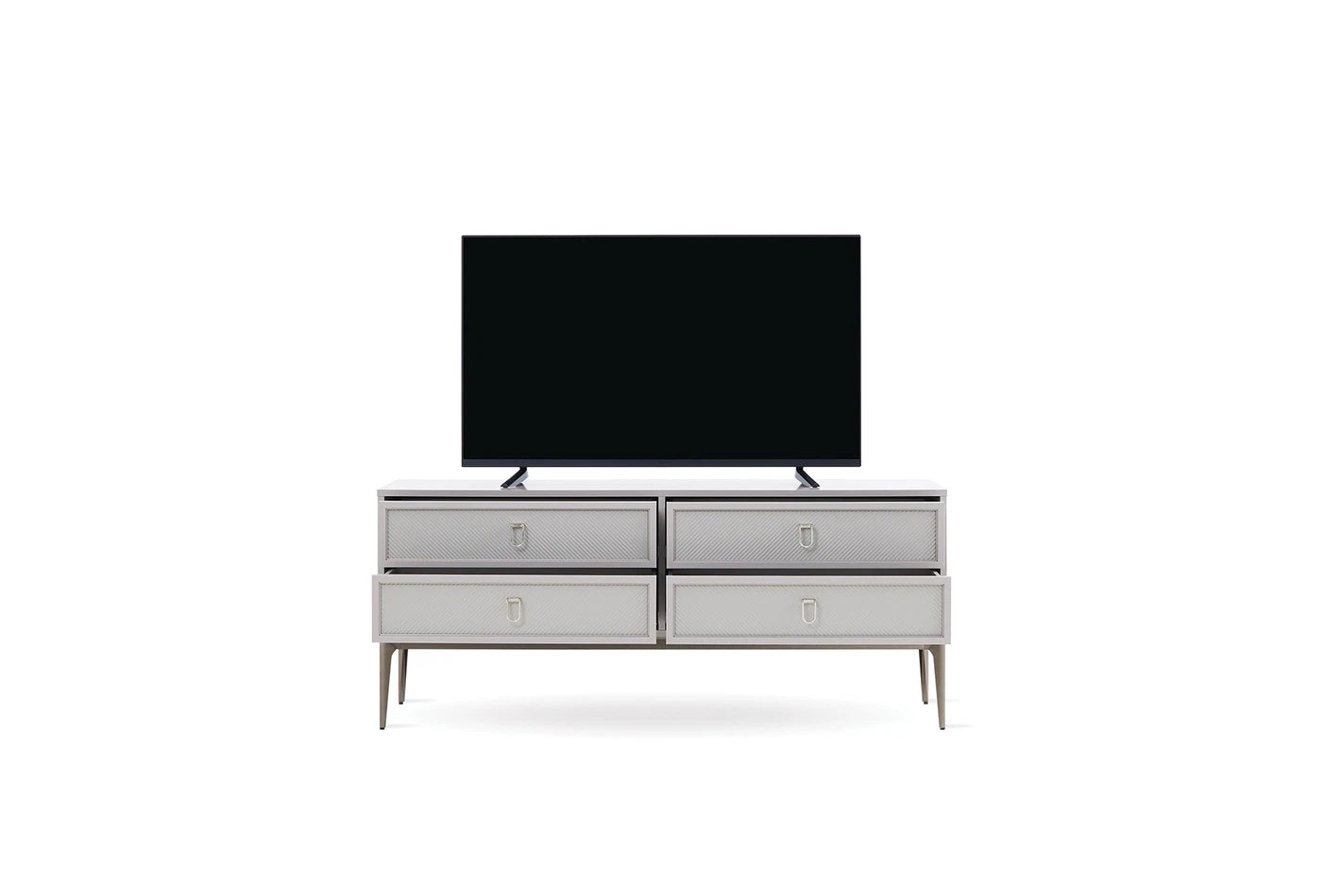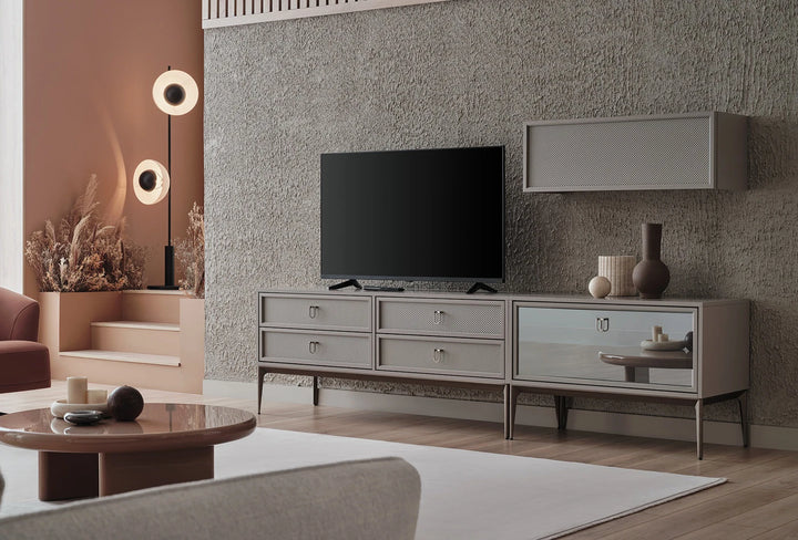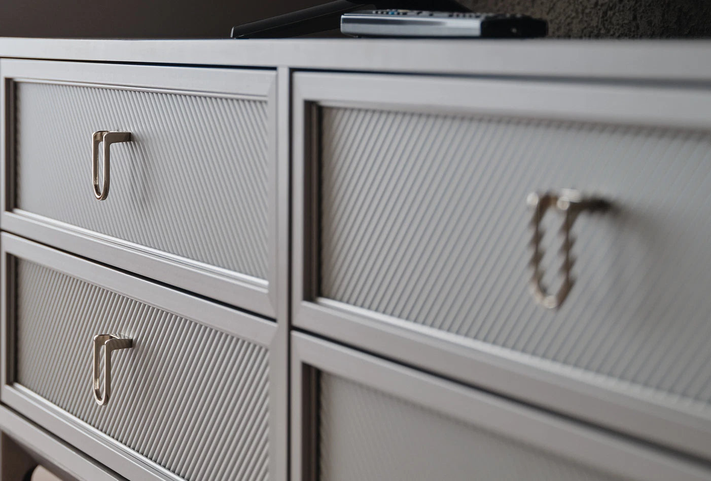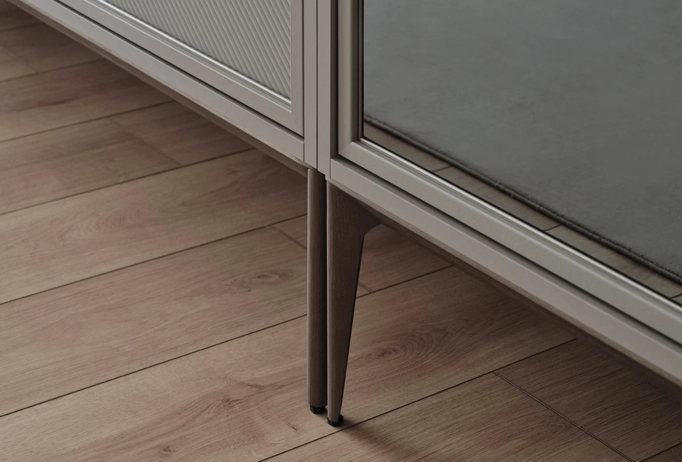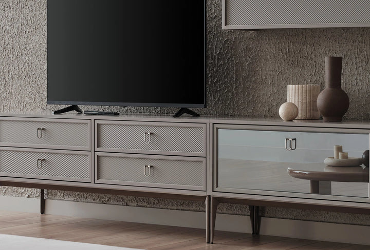 A 155 cm-es modellben lévő fiókok és füstszínű üvegrészlettel ellátott fedelek egyszerre nyújtanak funkcionalitást és esztétikát. A fém fogantyúk és lábak elegáns, fényes bronz érintése kifinomult hangulatot kölcsönöz a dizájnnak.