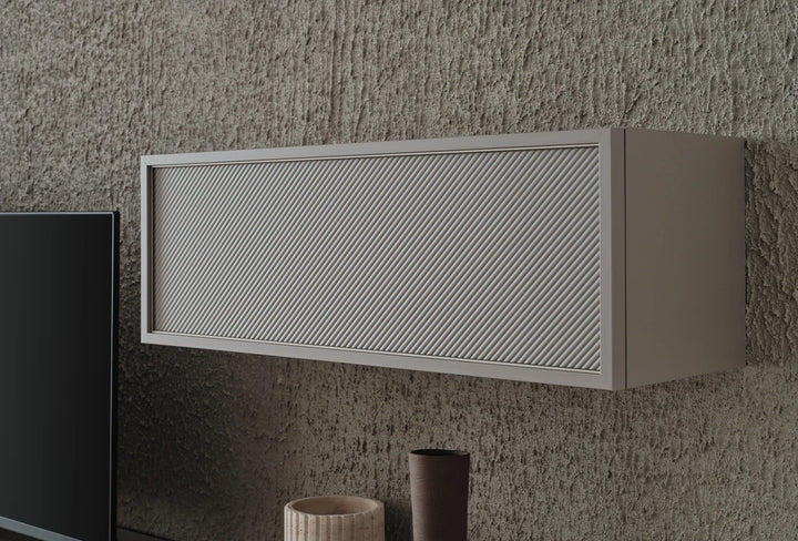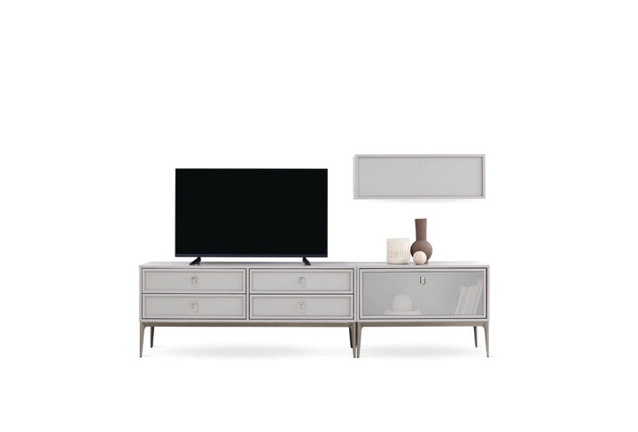 A Hera Tv állvány felnyíló fedelű felső modullal és natúr tükör részletekkel erősíti eleganciáját.