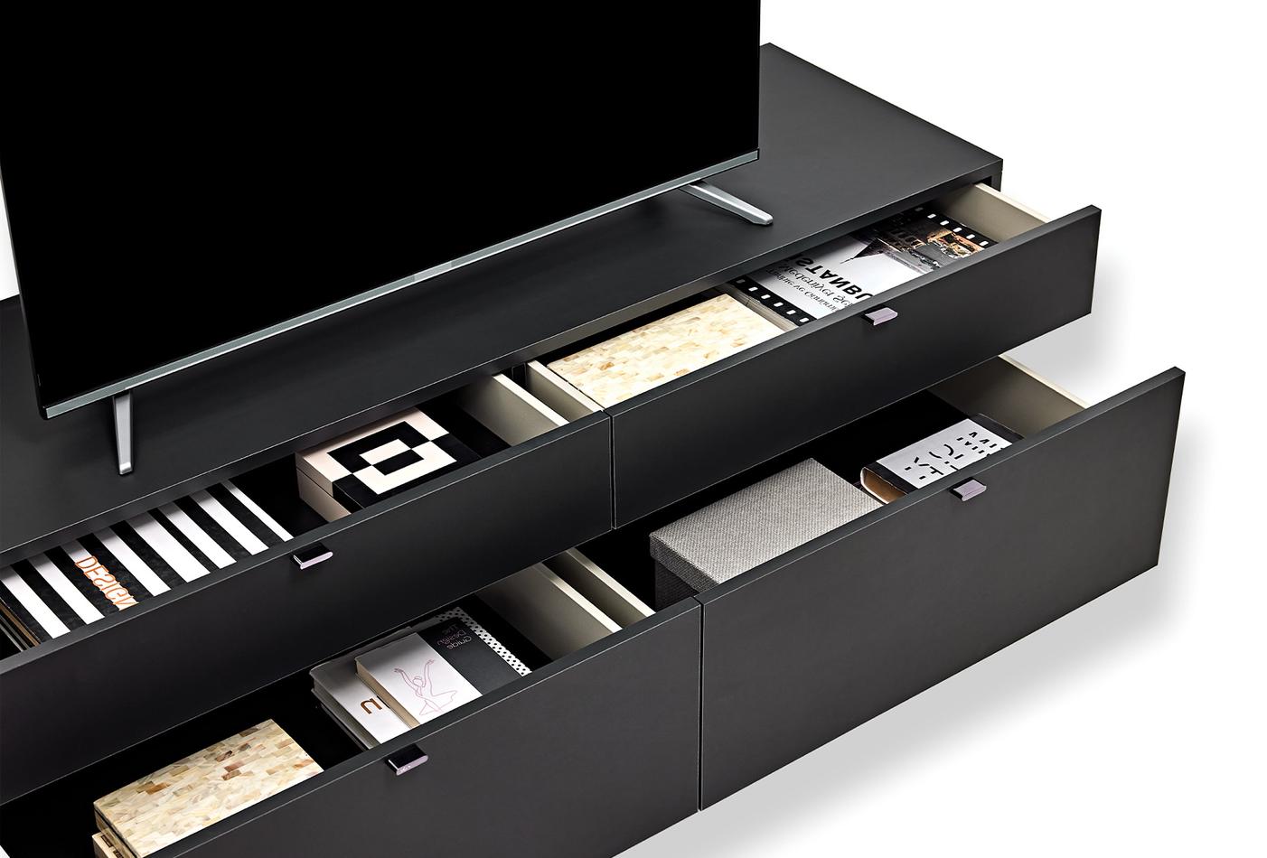 A LEGATO TV állvány tárolási funkciója előtérbe helyezésével tervezett fiókos moduljai maximális funkcionalitást kínálnak.