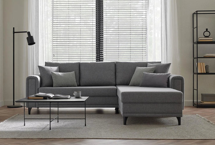 A MARIS L alakú kanapé szép és praktikus, az öt díszpárna pedig még kényelmesebbé és mutatósabbá teszi. Két különböző színű - antracit és dió - lábbal rendelhető, így mindenki könnyedén ki tudja választani az ízlésének leginkább megfelelőt.
